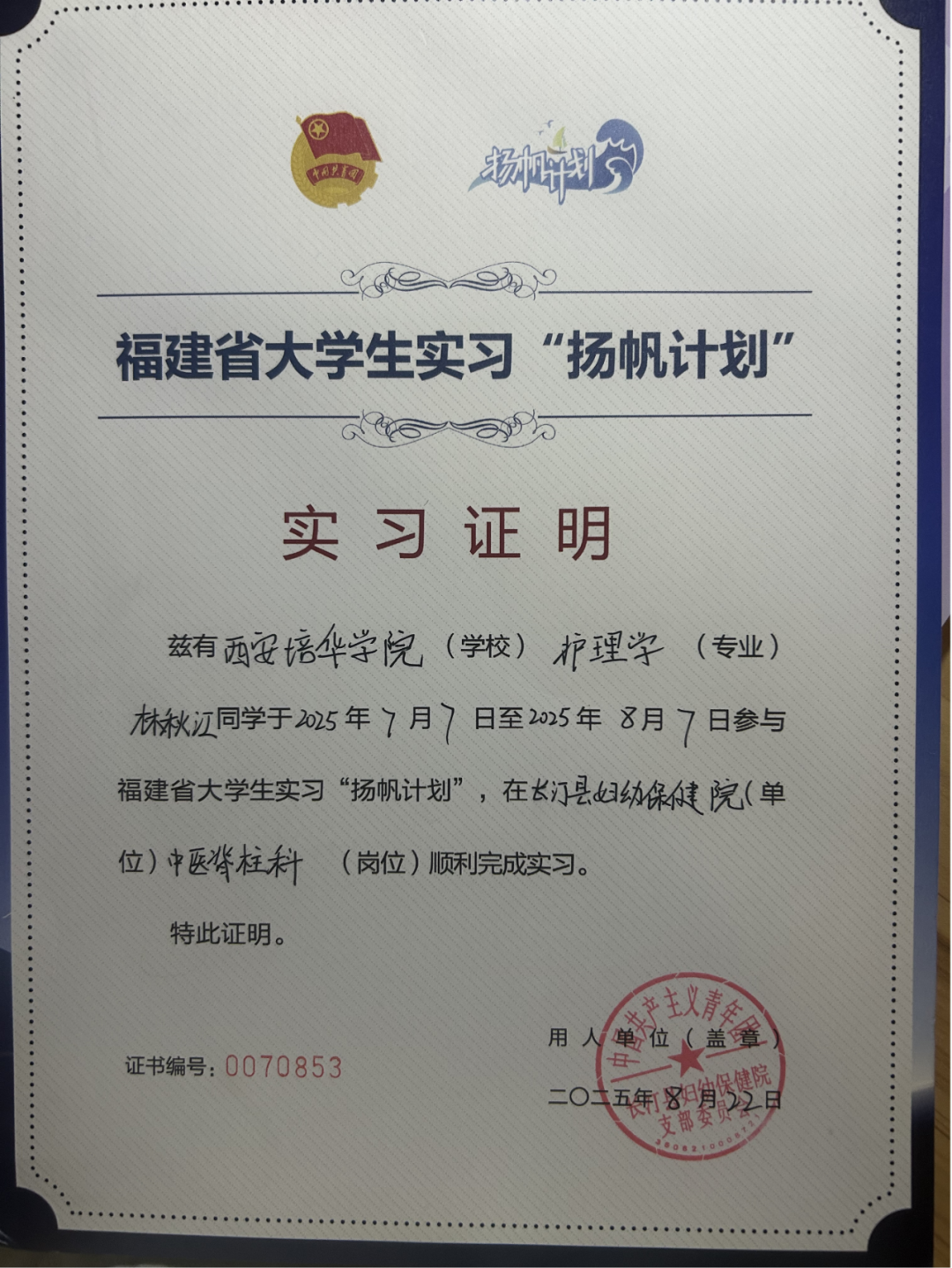 实践岗位:长汀县妇幼保健院中医脊柱科