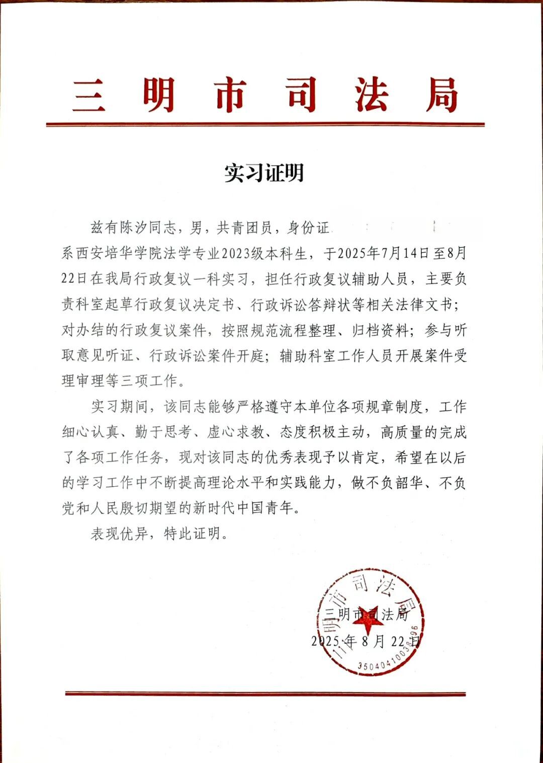心得体会:执笔协助起草行政复议决定书、行政诉讼答辩状,于字句推敲间淬炼“以事实为依据、以法律为准绳”的法治思想;严谨归档数百案卷,以零差错程序坚守筑牢正义基石;辅审案件研讨,体悟行政复议“监督权力、救济权利”的治理智慧。四十日基层淬炼,将抽象法条化为鲜活实践,更深刻领悟“法治建设重在基层”的时代内涵。身为新时代法学青年,定当铭记嘱托,以此次实习为起点,将专业素养与为民情怀熔铸于学业精进,以挺膺之姿投身法治中国建设,助力公平正义之光照彻闽山闽水。