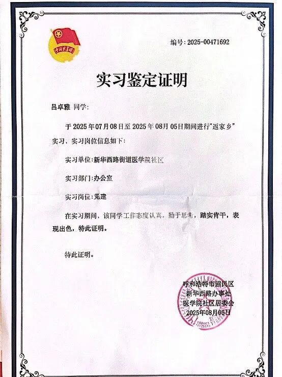 心得收获:此次志愿经历让我收获颇丰。不仅拓展了视野、提升了思维能力,更深入理解了基层卫健工作者守护公众健康的责任与使命。作为有过类似活动经验的学生,能正视自身实践短板,在重复的工作中始终保持严谨专注。这段经历让我切实体会到实践与学习结合的重要性,而基层工作者的敬业精神,也成为自己未来学术与职业道路上宝贵的精神财富,为未来职业规划提供了重要指导。