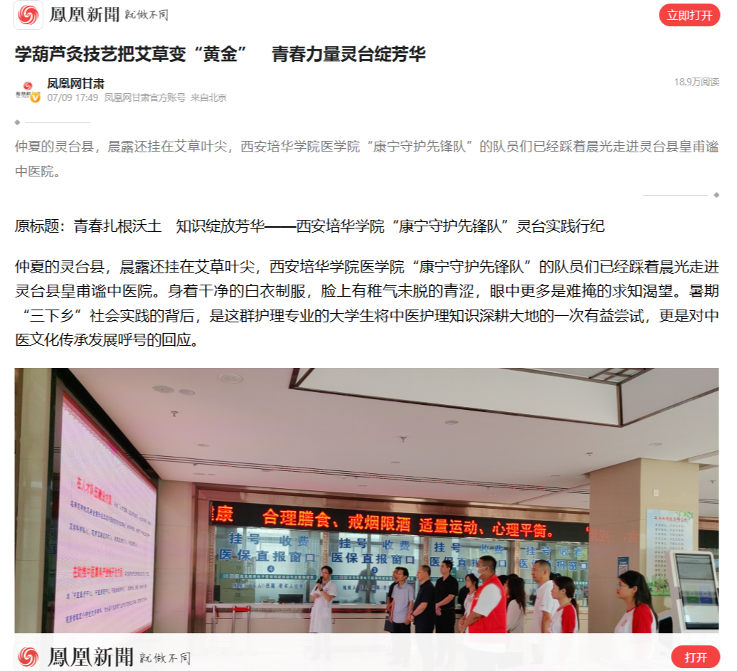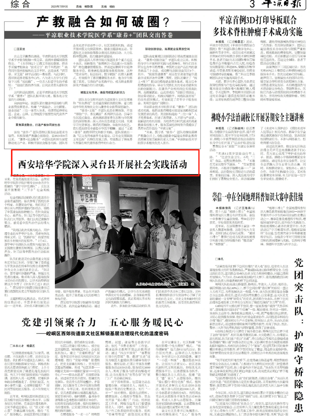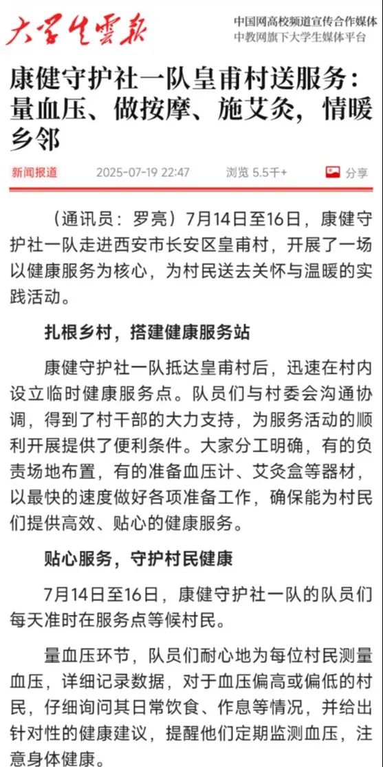 康宁守护先锋队赴平凉市灵台县开展暑期社会实践。团队围绕“医路护航助振兴·资助育人践初心”主题探访灵台多地,创新性地探索“医脉传承+乡村振兴”模式。以“医养结合+政策普及”为轴,为居民健康把脉,更为乡村教育播撒希望。开展义诊服务、资助政策解读、健康大讲堂共60场、服务覆盖超2000人;荣获表扬信与社会实践证明共24封。累计投稿568篇,被央广网、中华网、陕西青年融媒体中心、今日头条、平凉日报、平凉融媒体中心、灵台文旅、灵台县皇甫谧中医院等平台报道总阅读和点击量超120万。团队以实际行动诠释“知识改变命运,爱心回馈乡土”的新篇章,展现医学青年的责任与担当。