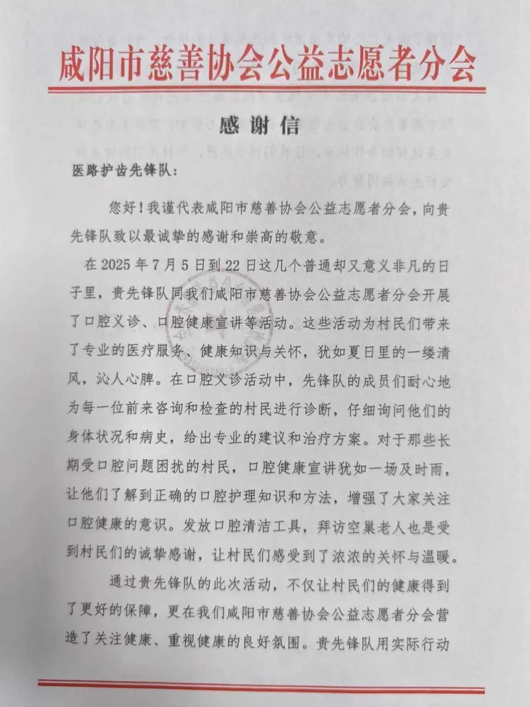 医路护齿先锋队以“呵护童齿龈铃笑,同心筑梦健康行”为主题,该队伍秉持着助力健康中国2030计划的原则,选择了淳化县进行三下乡社会实践活动。团队于7月5日至7月21日开展活动,主要有五个小组:策划组、外联组、宣传组、技术组、后勤组,由此开展口腔义诊以及儿童对牙齿的认识等。主要资源投入于活动物资以及口腔健康用品的采购。当前已成功投稿100余篇,累计收获感谢信3份,锦旗2枚,活动视频5个,《护齿小卫士》歌曲一个,活动总结视频1个。团队成员心得体会10份。后续将针对此活动进行总结归纳,同学们将继续学习更多的专业知识,并结合专业知识帮助更多需要帮助的人。为2030健康中国计划注入“青力量”。