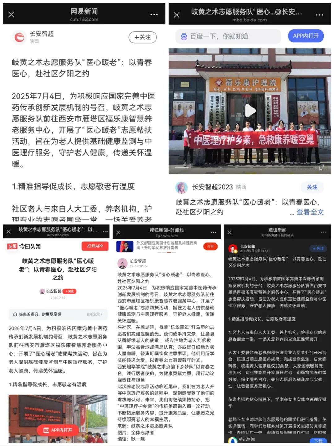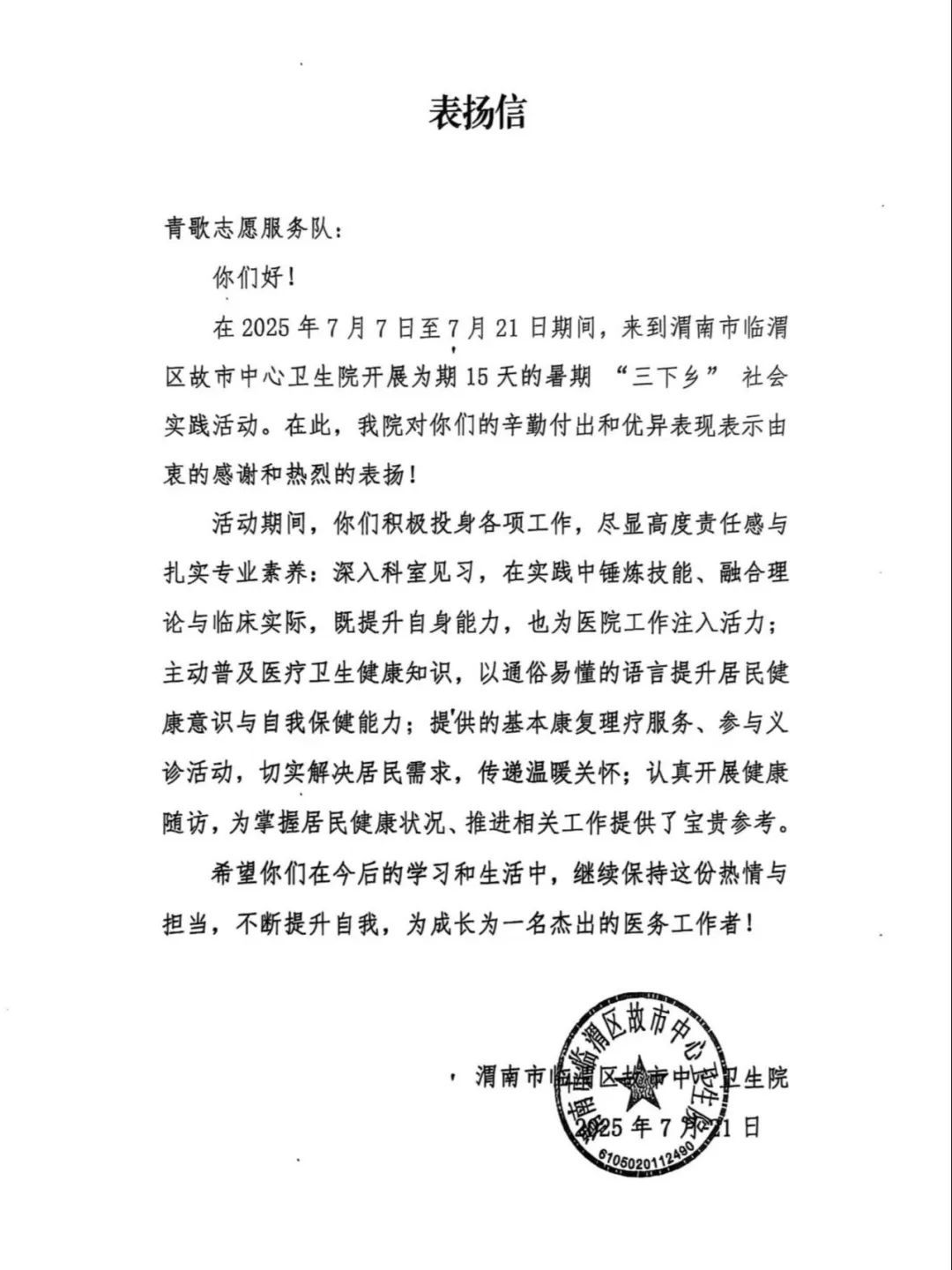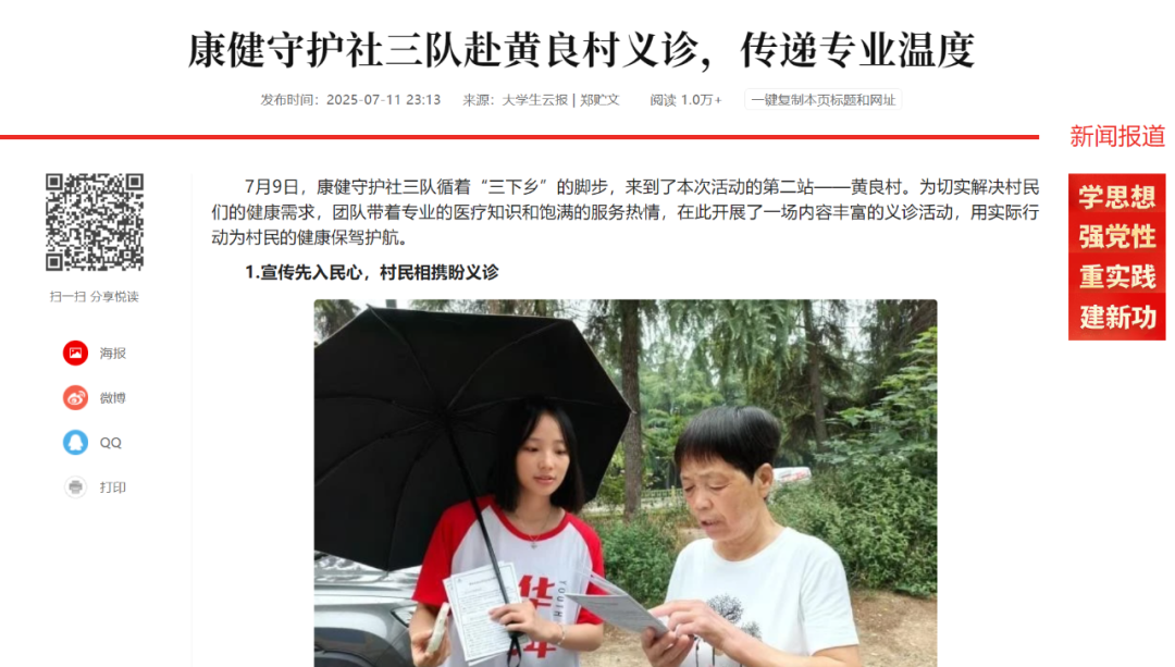 青歌志愿服务队秉持“青春行万里,青歌进万家”口号,投身三秦学子“三下乡”实践。7月7日起扎根渭南故市镇,发挥医学专长,开展义诊、覆盖社区、养老院、乡村等地(服务超400人次 ),推进分科室深度见习,让检验、护理实操落地;电话随访700名慢性病患者,科普知识并发放200份健康手册。同步挖掘艾草中医药文化,融入农事助农、文化场馆参观。实践收获实践证明17封、感谢信23封,超500篇媒体报道,渭南日报、爱临渭,临渭融媒等当地主流媒体多次聚焦,以医学担当赋能乡村健康与文化振兴,用青春书写医学生实践华章。