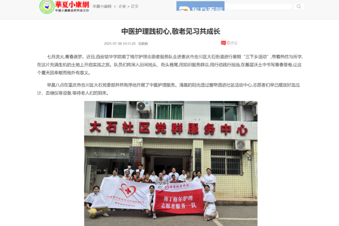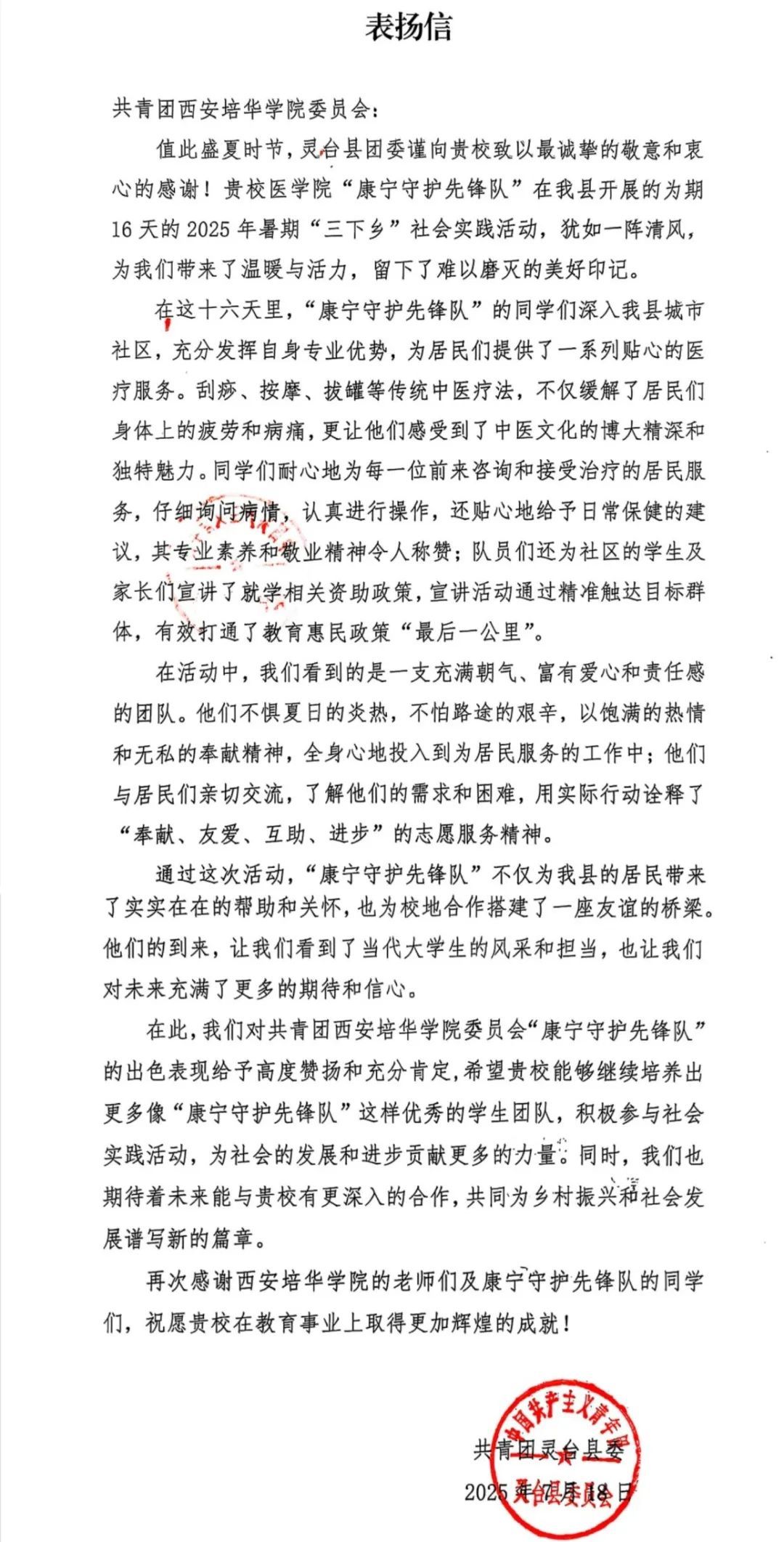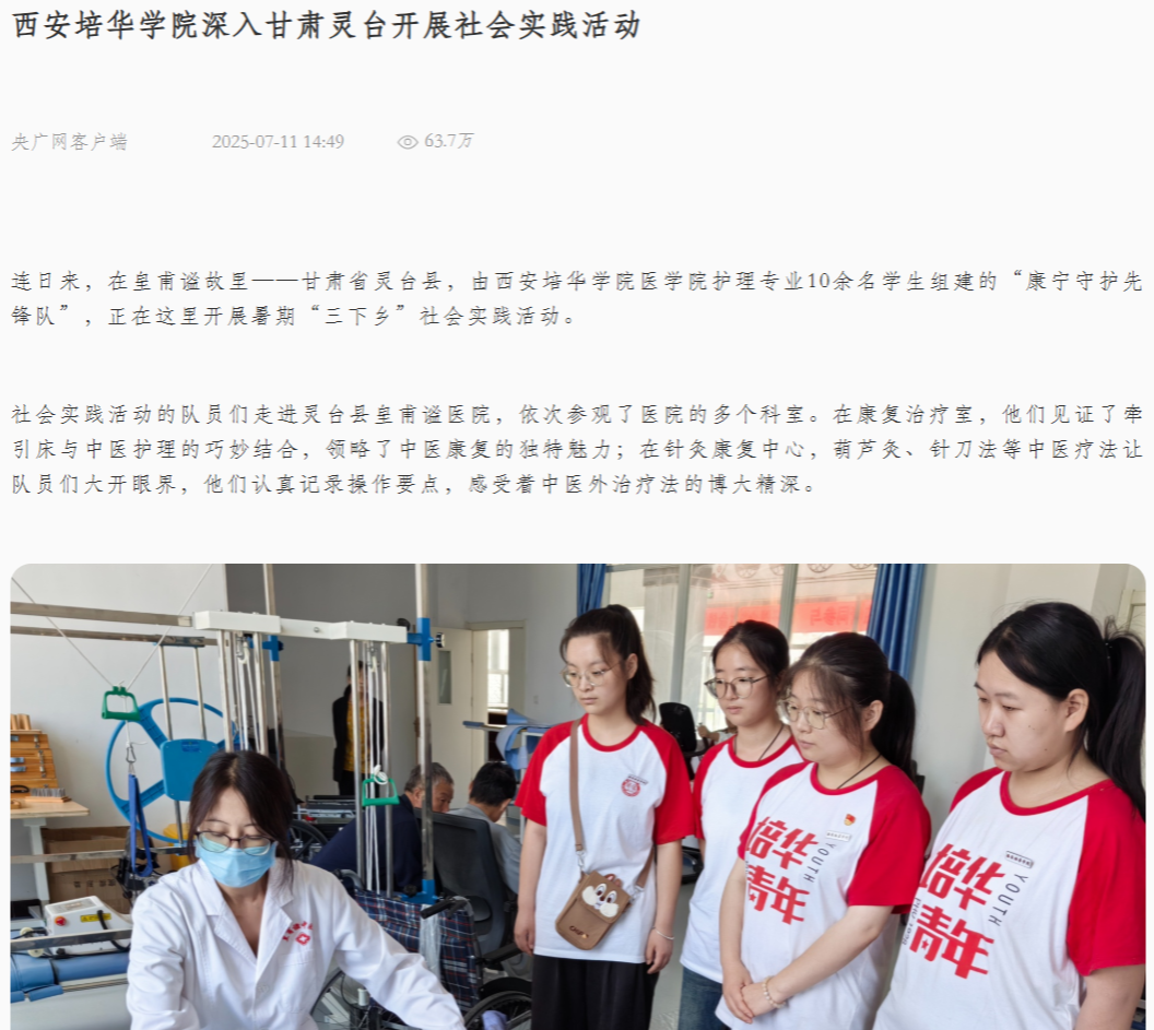 青护暖乡志愿服务队围绕“医心护健康,情暖乡村行”主题,深入陕西省延安市安塞区白坪街道,开展为期15天的2025暑期“三下乡”社会实践活动。团队通过健康义诊、中医理疗、卫生宣教、红色研学、关爱空巢老人和儿童陪伴等多种形式,服务群众超1000人次,切实将健康知识送入千家万户。活动期间,团队累计获得媒体报道300余次,其中国家级媒体20篇、省级媒体33篇、其他媒体247篇。实践过程中,团队共收到来自区团委、街道办、居委会、社工部、鼓乡爱心协会的5封社会实践证明及4封表扬信,充分展现了培华青年在新时代背景下服务社会、奉献基层的青春担当与责任使命。