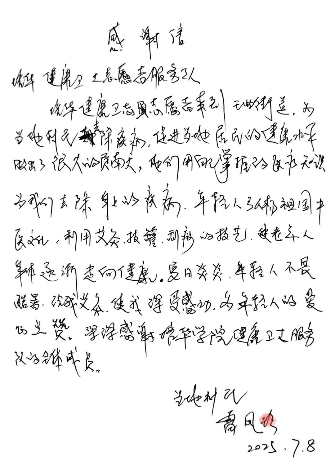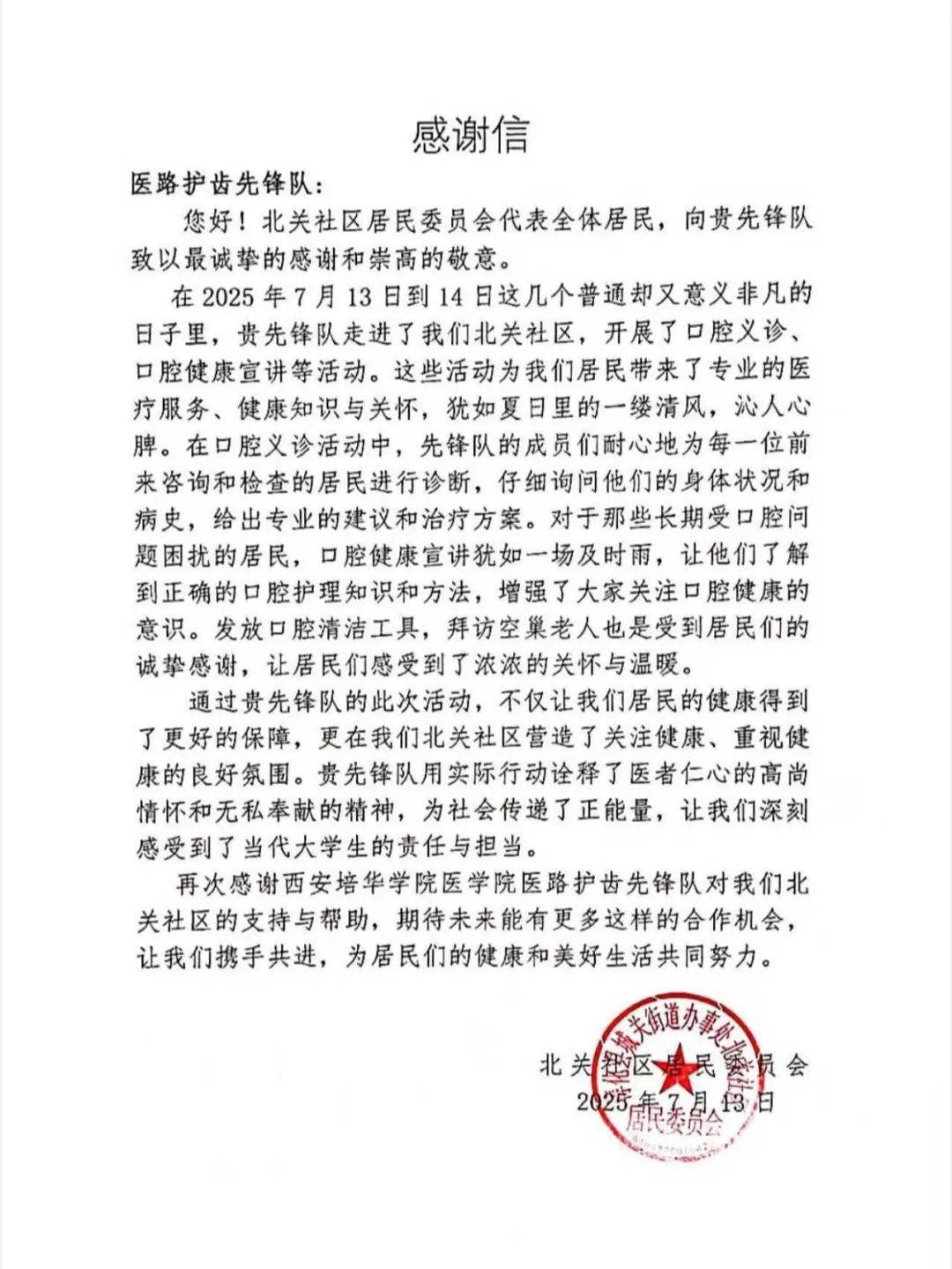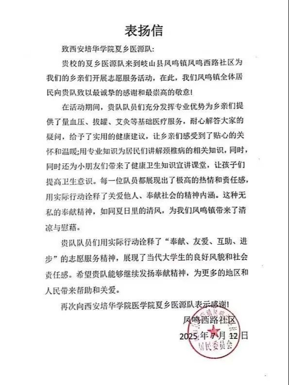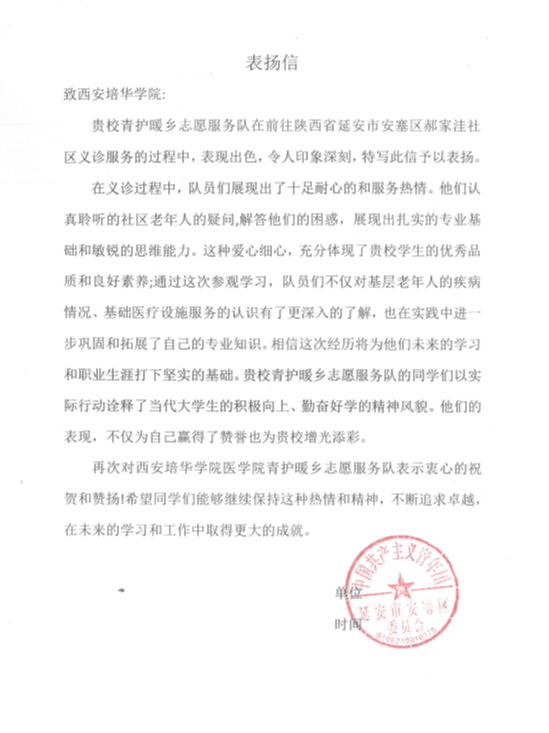 青护暖乡志愿服务队围绕“医心护健康,情暖乡村行”主题,深入陕西省延安市安塞区白坪街道,开展为期15天的2025暑期“三下乡”社会实践活动。团队通过健康义诊、中医理疗、卫生宣教、红色研学、关爱空巢老人和儿童陪伴等多种形式,服务群众超1000人次,切实将健康知识送入千家万户。活动期间,团队累计获得媒体报道300余次,其中国家级媒体20篇、省级媒体33篇、其他媒体247篇。实践过程中,团队共收到来自区团委、街道办、居委会、社工部、鼓乡爱心协会的5封社会实践证明及4封表扬信,充分展现了培华青年在新时代背景下服务社会、奉献基层的青春担当与责任使命。