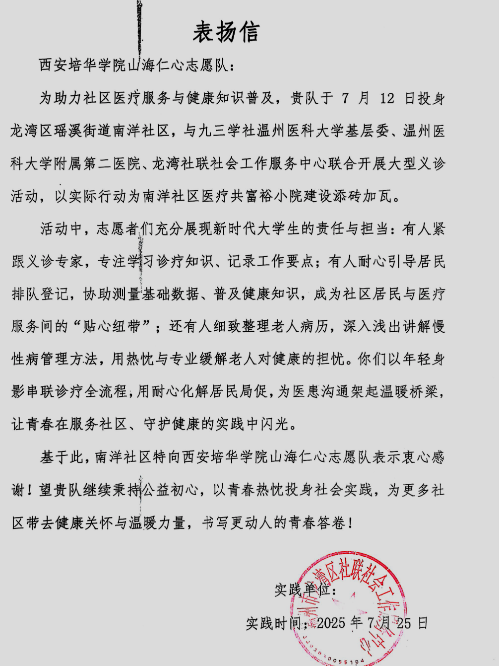 山海仁心志愿队于浙江省温州市龙湾区南洋社区开展为期10天的三下乡社会实践。实践队携手温医大附二院深入社区提供多元服务:协助开展义诊活动,累计服务群众200余人次,进行健康检查;参与儿童陪伴活动,通过趣味互动传递关爱;助力组织健康知识讲座,提升居民健康素养。同时团队积极开展普通话使用情况问卷调查,了解社情民意。队员们以专业热忱助力社区健康建设,展现青年担当。实践活动获得广泛关注,团队累计投稿各级自媒体报道622篇,其中国家级179篇、省级192篇、市级171篇、区县级79篇、校级1篇,截至目前共得到中国医疗行情报、温度新闻、九三学社温州市委员会、阅龙湾等媒体专题报道。
