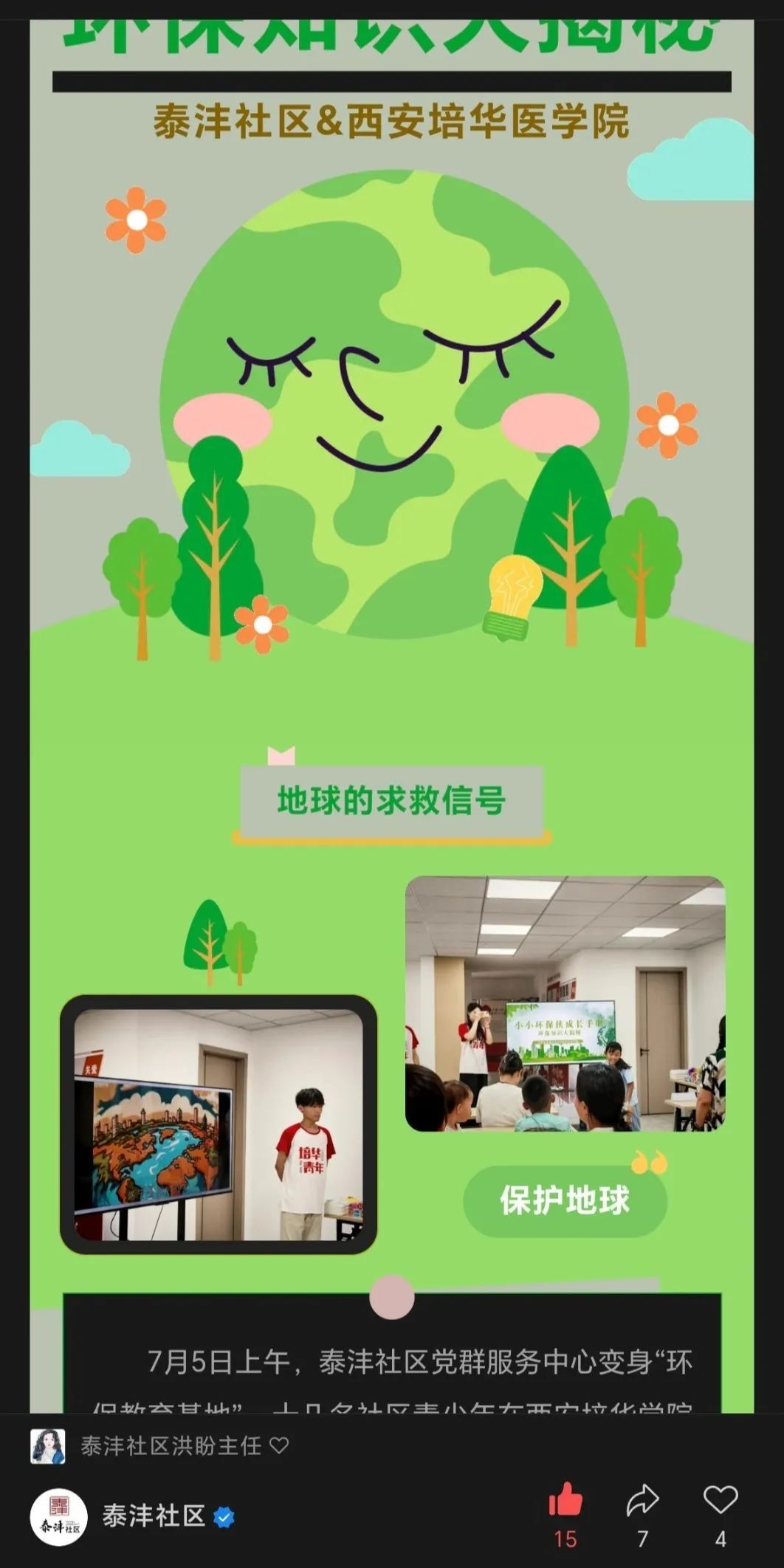 医暖童耆志愿服务队于7月7日-18日前往西安市神舟六路社区开展以“医暖社区守耆童,健康服务践初心”的主题活动,期间针对老年人提供刮痧、艾灸、拔罐等中医服务以缓解身体不适,同时还教他们练习八段锦和拍八虚来增强体质;面向小朋友则通过模拟场景演示教急救操作,借助图画讲解器官常识,并教他们做洗手操和口齿唇动操以培养良好卫生习惯。此次活动累计时长60小时,累计服务120人次,累计发表新闻稿50余篇。这次活动不仅提升居民健康认知,扩大中医文化影响力,用行动架起老少关怀桥梁,也让社区洋溢温暖与活力,助力构建和谐社区生态。