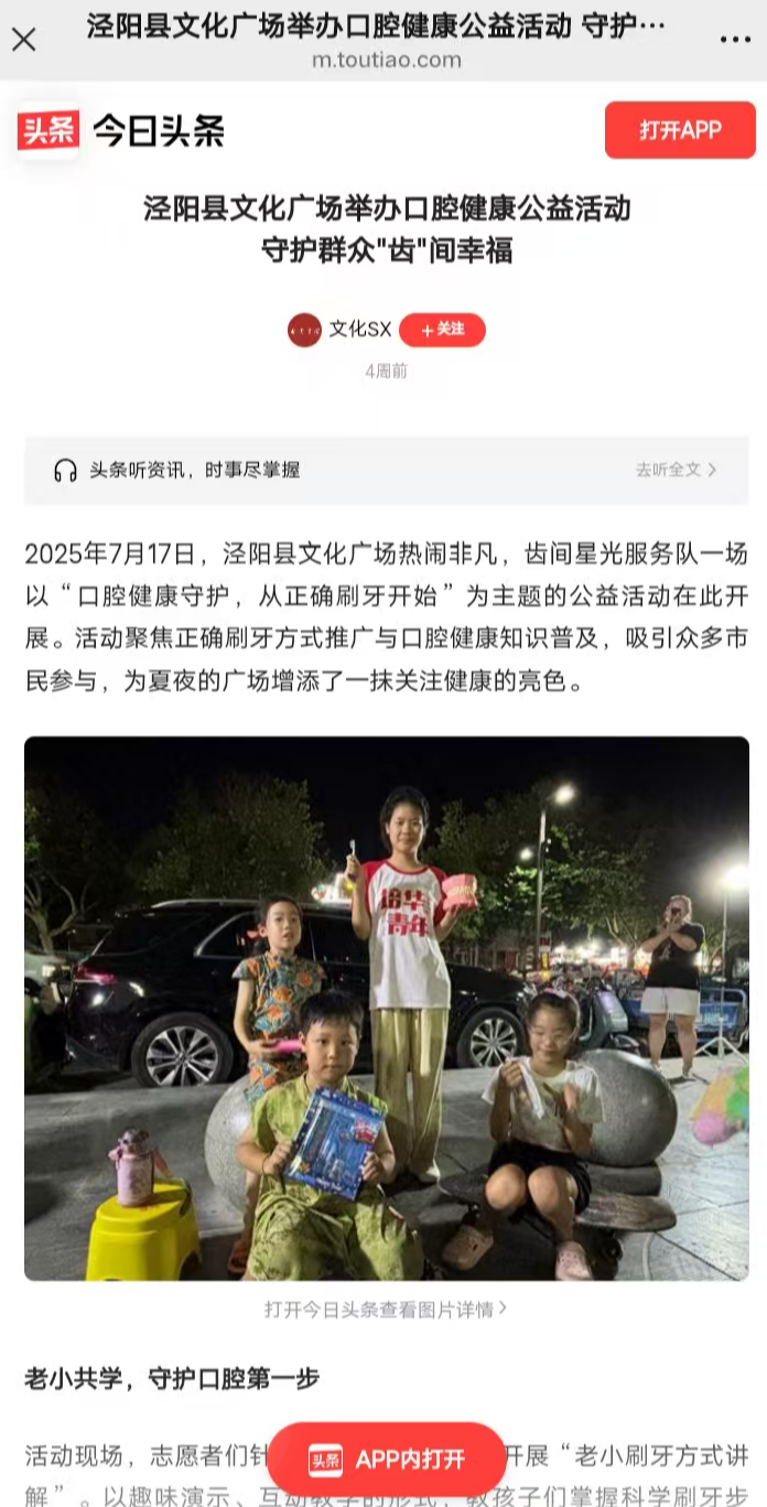 齿尖星光服务队以“茯茶润心,皓齿同行”为主题,在陕西省咸阳市泾阳县开展了为期14天的社会实践服务活动。在泾阳县多地举办口腔健康公益活动,普及护牙知识;走进茯茶镇,结合茶文化调研进行健康科普;探访茯茶非遗场馆,感受文化魅力;还走进安吴青年训练班纪念馆,传承红色精神。通过此次实践活动,齿星光服务队累积服务时间过百小时,获得当地调查问卷150份,为当地留守儿童发放关爱礼包20份。截至目前团队获得到今日头条、百度新闻、西部新闻网、多彩青年网等国家级媒体报道15篇,省市级媒体报道6篇,校级媒体报道6篇。
