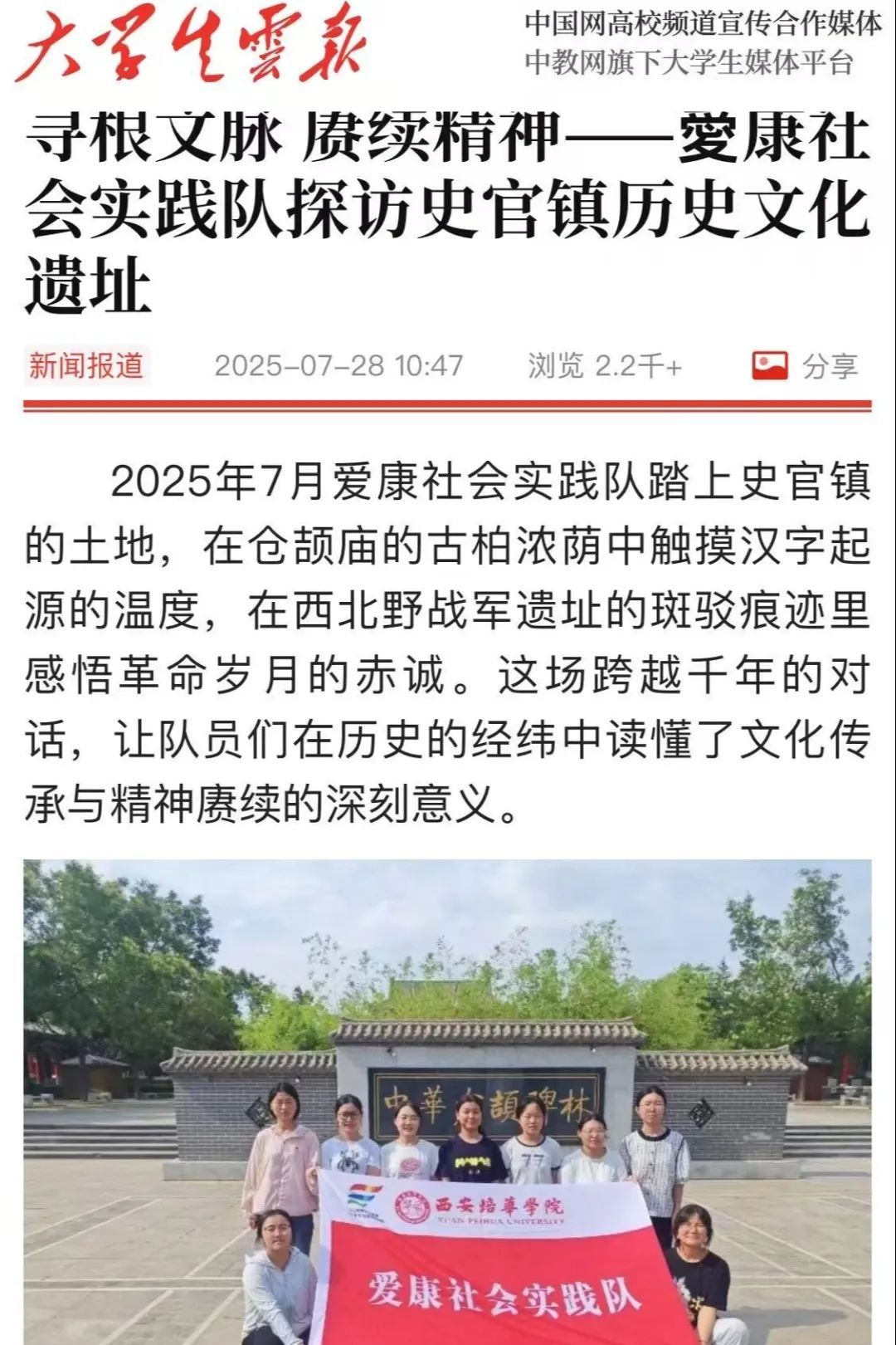 2025年7月3日,夏乡医源队12名学子赴陕西岐山县,旨在感受岐黄中医文化魅力、传承非遗,用行动书写青春。团队以校地协同、研学结合、公益服务模式,将医学价值转化为基层实践效能:深入医院轮转见习,赴岐伯纪念馆、中药材基地及加工厂学习中医文化与种植、炮制、质控,普及“三高”防治知识,以岐黄之术服务千余名乡亲。团队已获县融媒体等专题报道7篇,自媒体报道500余篇,6封表扬信及20份实践证明,用行动推动青春与乡村振兴“双向奔赴”,让岐黄文化在护佑民生中熠熠生辉。