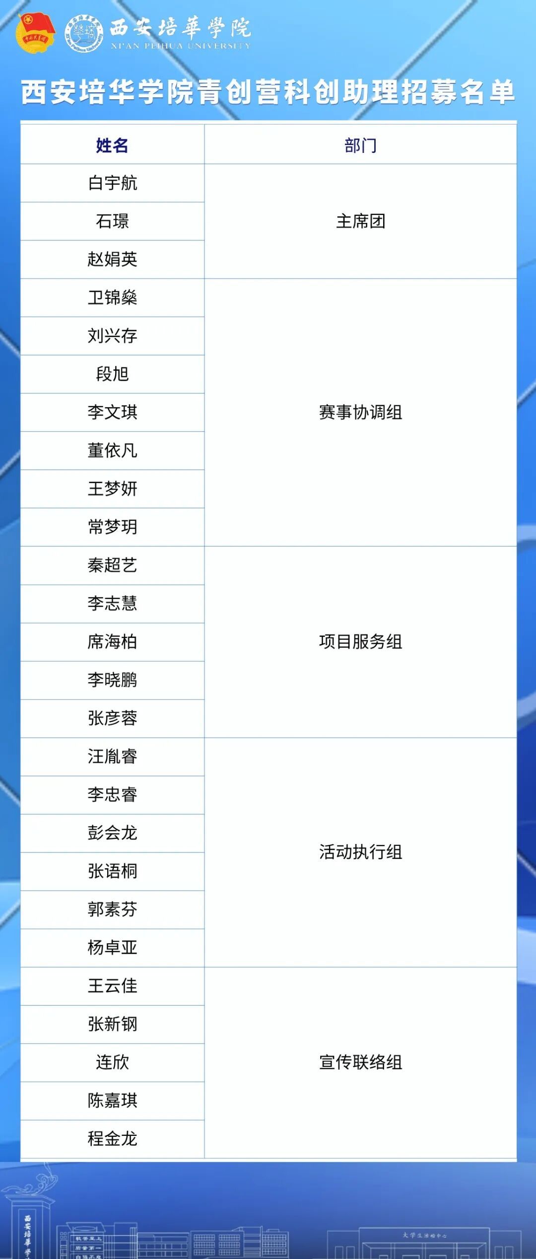 恭喜以上同学成功入选校团委青创营科创助理团!在这里,你可以近距离接触优质科创项目、全程参与顶级双创赛事、对接校内外优质科创资源,和一群志同道合的伙伴一起成长。期待和你一起,在校园里点亮更多青年的创新创业梦想,打造属于我们的青年科创成长平台!