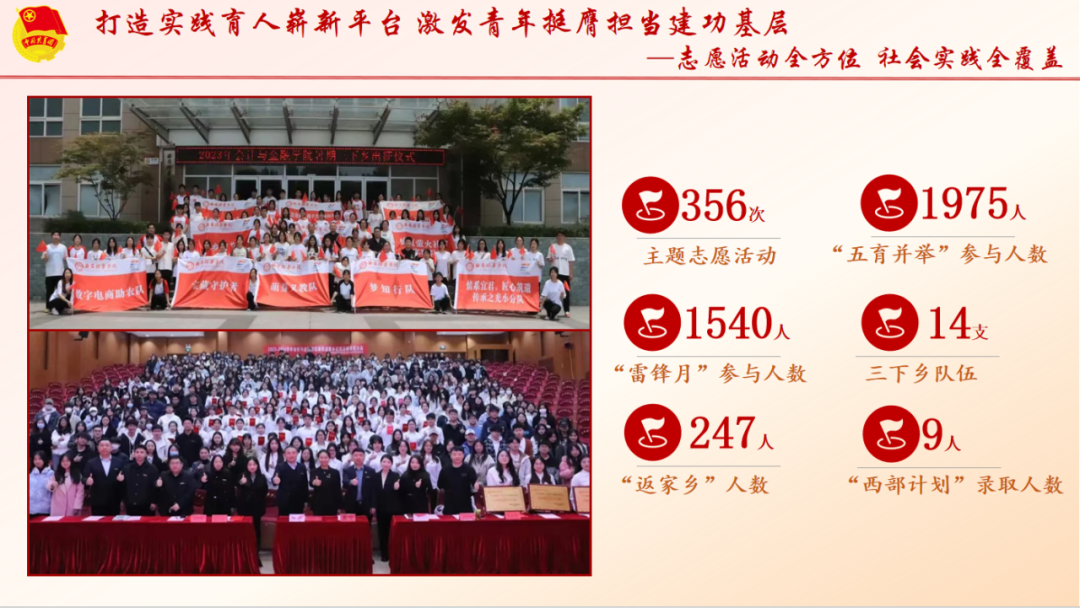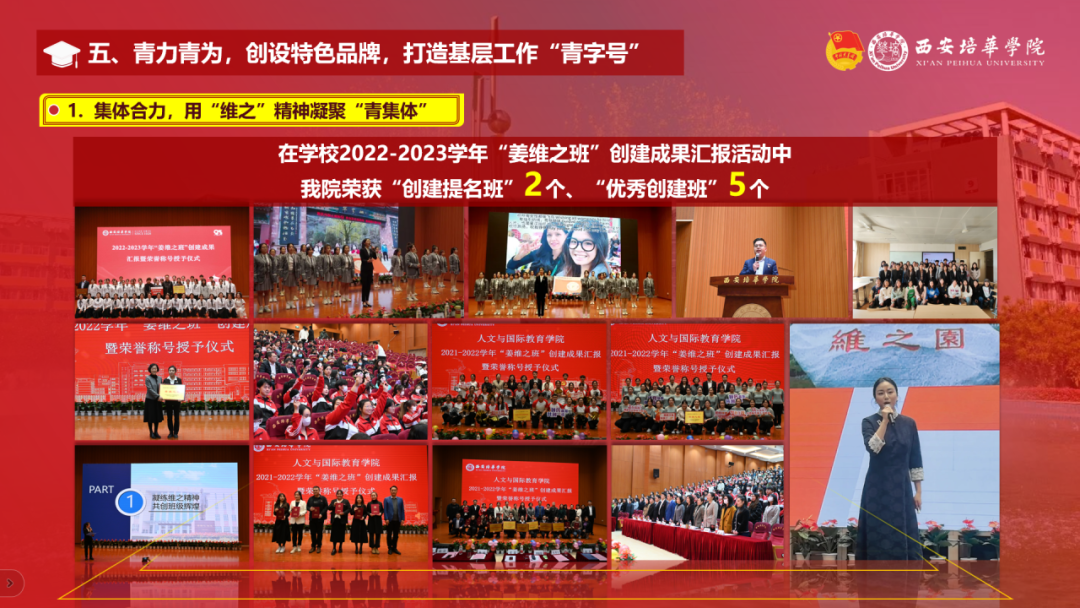 人文与国际教育学院团委始终高举习近平新时代中国特色社会主义思想伟大旗帜,紧扣围绕中心、服务大局的工作主线和服务青年的工作生命线,认真开展团学工作、扎实推进基础团务、坚持服务学生、引领青年成长成才。一是青春筑基、把握青年脉搏、提升团的“引领力”。铸魂强基,思想引领有力有效;紧抓契机,专题学习入脑入心;把握脉搏,学习形式创新创精。二是青春赋能、织密建设体系、提升团的“组织力”。固本培元,团学组织提质增效;榜样引领,激发学生内生动力。三是青春护航、回应所需所盼、提升团的“服务力”。多措并举,就业服务见行见效;以行践学,深入基层笃学践行。四是青春建功、勇担时代使命、提升团的“贡献度”。彰显特色,文化活动有声有色;搭台赋能,理论宣讲笃信笃行;躬身入局,志愿服务尚美至善。五是青力青为、创设特色品牌、打造基层“青字号”。集体合力,用“维之”精神凝聚“青集体”;宣传聚力,用“筑梦”品格融合“青平台”;思想助力,用“云梯”性质倾听“青声音”。