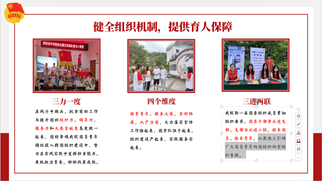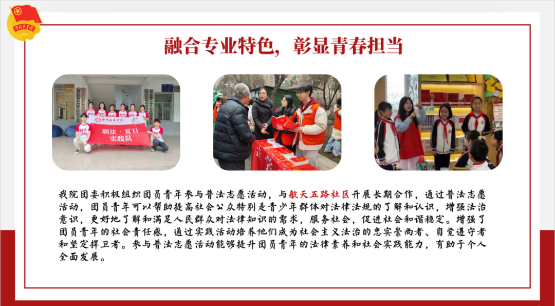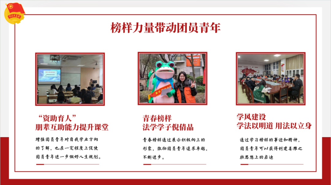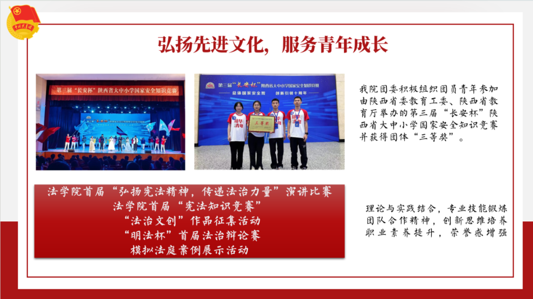 法学院团委始终坚持以习近平新时代中国特色社会主义思想为指导,严格按照院党总支和校团委的要求,牢牢抓住从严治团的指导思想,争做青年的知心人、热心人、引路人。一是注重健全组织机制,提供育人保障。聚焦“三力一度”新时代共青团工作布局,从“凝聚青年,服务大局,当好桥梁,从严治团”四个维度,利用“三进两联”的方式,引领广大团员青年;二是强化思想引领,筑牢精神底色。加强理论学习,提高思想站位,注重榜样力量带动团员青年,持续推动青年大学习学习工作;三是融合专业特色,彰显青春担当。积极组织参与普法志愿活动,重视大学生寒假返乡“五育”并举系列实践活动;四是弘扬先进文化,服务青年成长。积极对接西北大学、西北政法大学等同类专业院校,组织团员青年进行交流学习,积极组织团员青年参加专业知识、创新创业等竞赛,理论与实践结合,锻炼团队合作精神,创新思维培养职业素养提升。