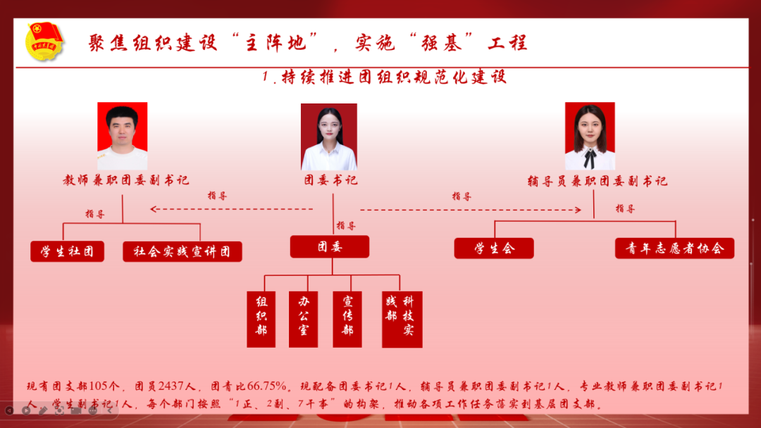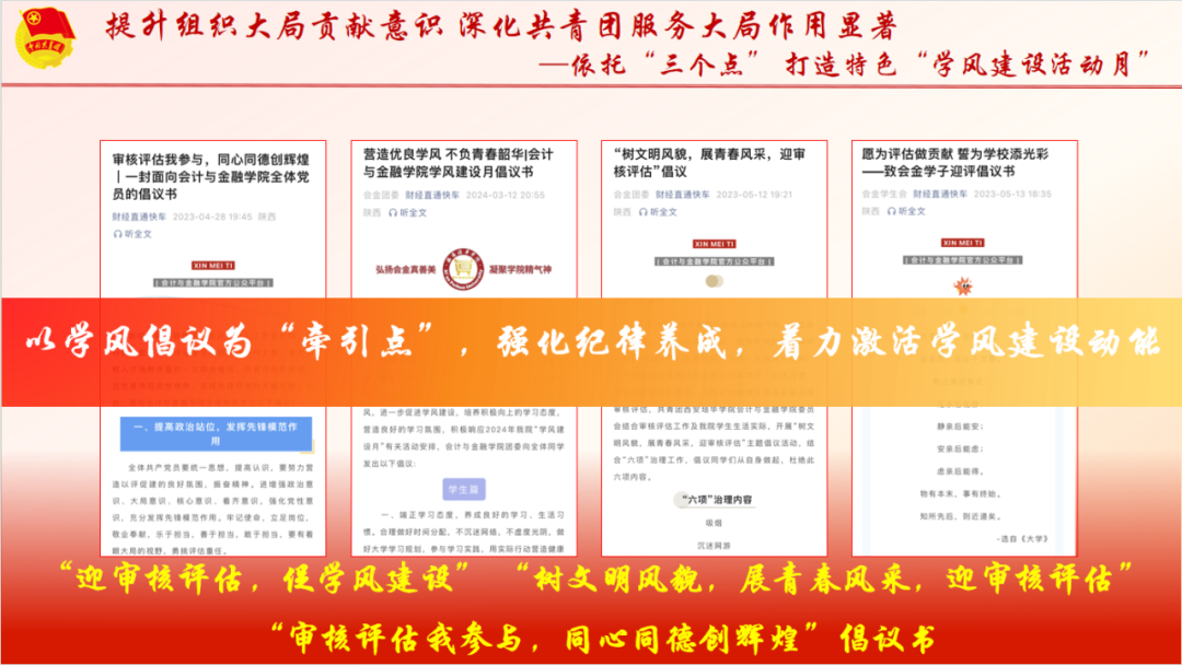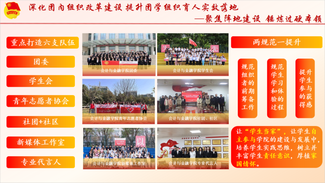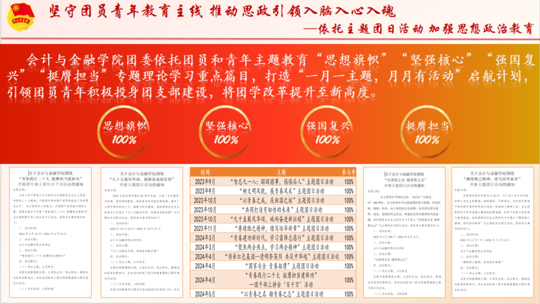 会计与金融学院团委始终坚持以习近平新时代中国特色社会主义思想为指导,在校团委、院党委的正确领导下,以党建带团建、团建带班建的工作思路,构建一二三四团学工作格局,坚持以“为党育人,为国育才”为目标,围绕两支队伍、三力一度、四项工程,不断提升团的组织力、引领力、服务力和贡献度。一是坚守团员青年教育主线,推动思政引领入脑入心入魂。打造特色主题团日活动,让新理论、新思想进青马、进支部、进宣讲、进社团、进社区、进实践。以“一月一主题,月月有活动”启航计划,将团学改革提升至新高度;二是深化团内组织改革建设,提升团学组织育人实效落地。精心打造品牌化活动,扎实开展“三会两制一课”;三是打造实践育人崭新平台,激发青年挺膺担当建功基层。实现志愿活动全方位、社会实践全覆盖;四是提升组织大局贡献意识,深化团学服务大局作用显著。以学风倡议为“牵引点”,以学风引领为“着力点”,以朋辈榜样“突破点”,做好分类引导,着力激发学风建设活力。