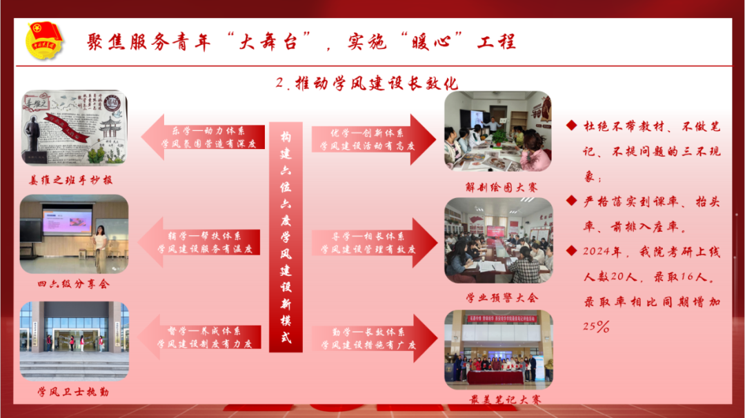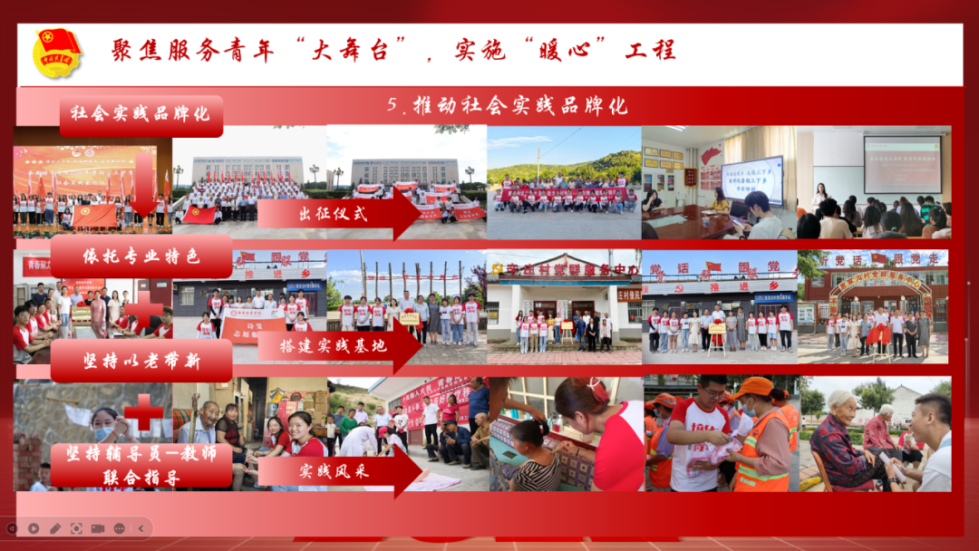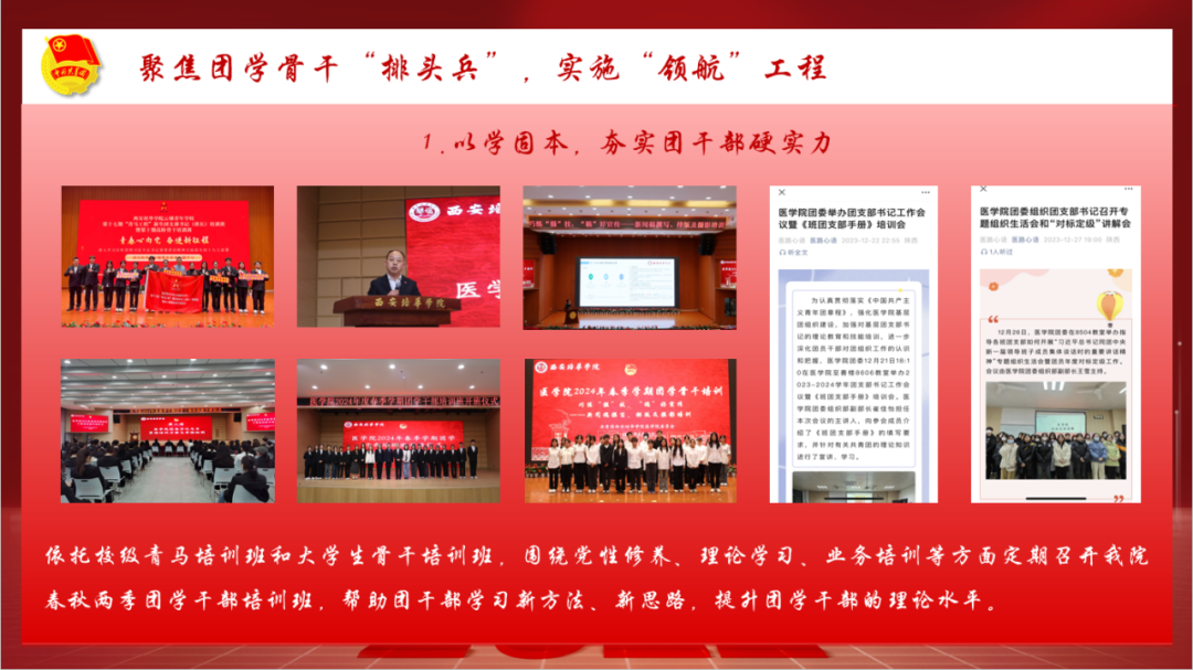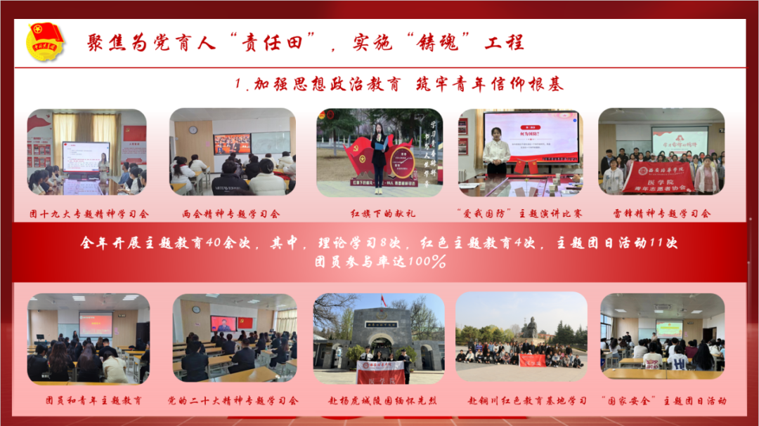 医学院团委以学习贯彻党的二十大精神为主线,以创建团建标杆院系为契机,坚持四聚焦,实施四工程,着力提升学院共青团工作的组织力、服务力、引领力和贡献度。一是聚焦为党育人“责任田”,实施“铸魂”工程。加强思想政治教育,筑牢青年信仰根基;深挖模范典型,塑造青春榜样;搭建媒体宣传平台,拓展网络育人能力。二是聚焦组织建设“主阵地”,实施“强基”工程。持续推进团组织规范化建设;深化学生组织改革;扎实推进从严治团;持续推进班团一体化建设。三是聚焦团学骨干“排头兵”,实施“领航”工程。以学固本,夯实团干部硬实力;以干提能,练就团干部真本领;以评增效,考出团干部新活力。四是聚焦服务青年“大舞台”,实施暖心工程。推动权益维护规范化、学风建设长效化、校园文化多样化、社会实践品牌化。