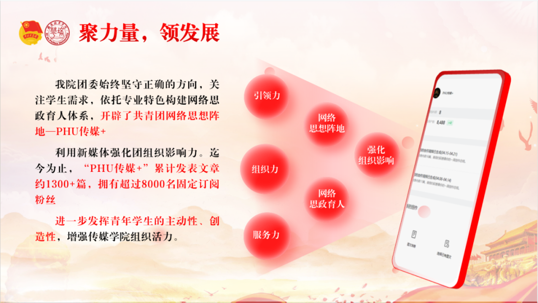 传媒与设计学院团委始终坚守“引领凝聚青年、组织动员青年、联系服务青年”的工作格局,持续强化团员青年思想引领,深化党建引领,构建“笃行”社区。固思想,升觉悟。以习近平新时代中国特色社会主义思想为指导,紧抓关键时点和历史大事,以领导力、组织力和服务力为驱动,策划超百余场“红色文化及德育”活动;严治团,夯基础。聚焦“加强支部凝聚力,激发支部活力”工作要点,开展系列特色主题团日活动,组织团务工作学习会,创新基层团建的工作思路和方法;实立德,焦素能。落实立德树人,发挥带头作用,在暑期“三下乡”社会实践活动、“返家乡”社会实践中引领学生成才,助力乡村振兴;凝力量,领发展。坚守正确的方向,关注学生需求,依托专业特色构建网络思政育人体系。