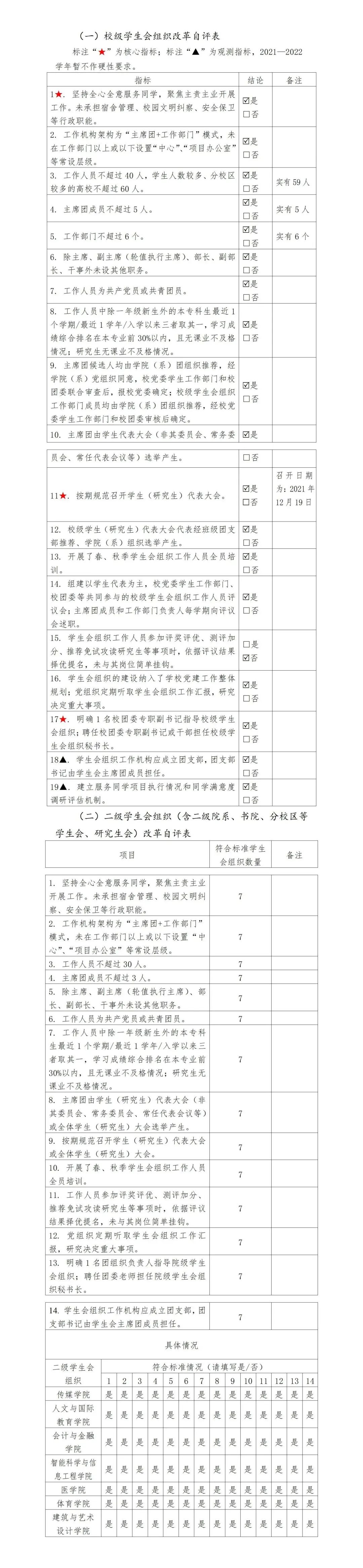 为落实共青团中央、教育部、全国学联联合下发的《关于推动高校学生会(研究生会)深化改革的若干意见》,并结合《关于巩固高校学生会(研究生会)改革成果的若干措施》文件要求,接受广大师生监督,现将我校2021—2022学年学生会(研究生会)改革情况公开如下。