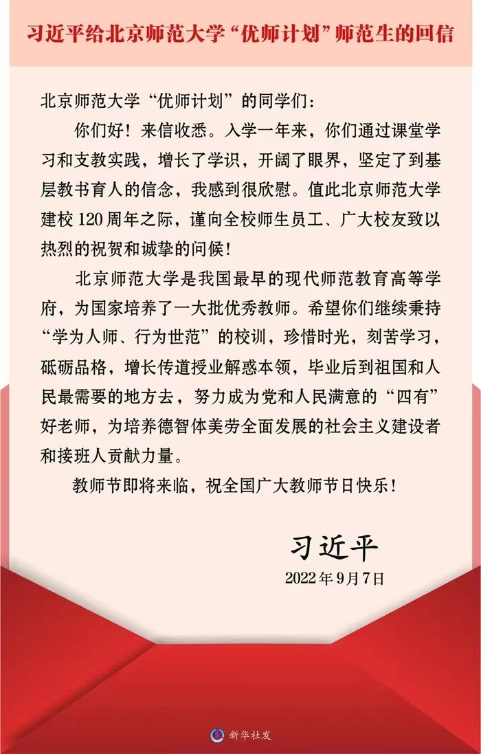 中共中央总书记、国家主席、中央军委主席习近平9月7日给北京师范大学“优师计划”师范生回信,对他们寄予殷切期望,并在北师大建校120周年和第三十八个教师节来临之际,向该校师生员工、广大校友表示祝贺和问候,向全国广大教师致以节日的祝福。