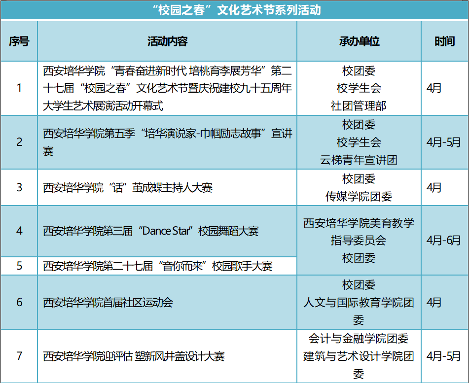 西安培华学院“校园之春”文化艺术节连续多年开展举办,已成为校园文化传播的重要途径和大学生思政教育的有效载体,是校园文化活动的重要组成部分。学校广泛动员,积极宣传,鼓励和引导学生积极参与,在校园之春的文化庆典上,展示耀眼才华、释放无限魅力。