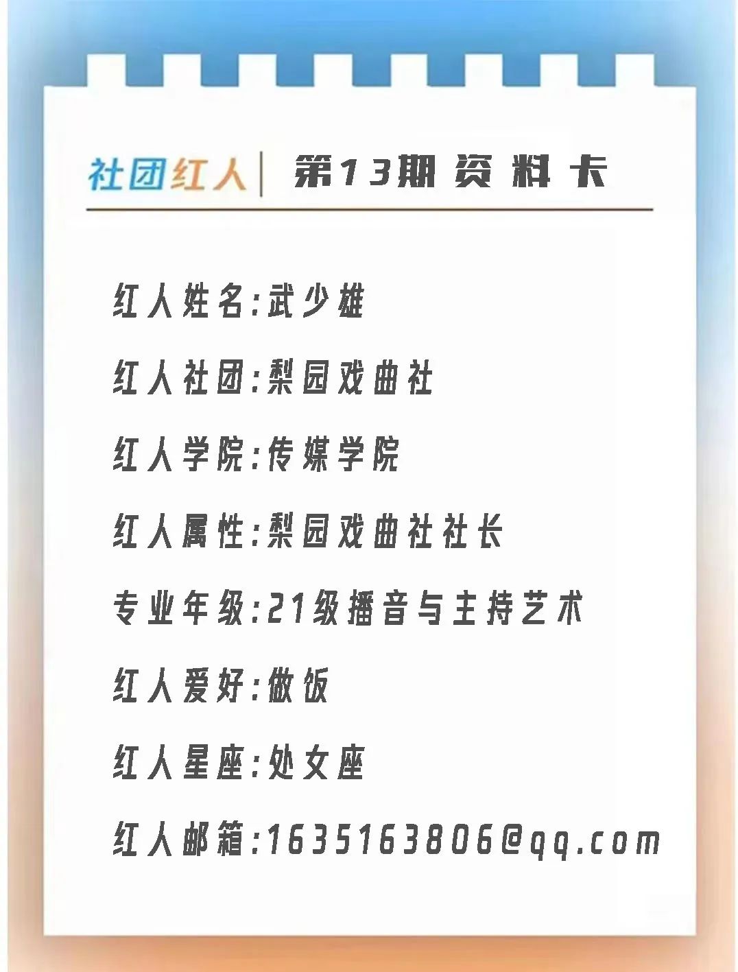 在平时生活中,武学长是一个性格开朗十分健谈的人,很容易和大家打成一片。他还有很多小技能!比如很~会做饭!(听说他们三下乡的时候他以自己优秀的厨艺,俘获了大家的心!)很~会配音!(拿了好多含金量很高的奖项)很~会唱戏!(花脸专业户!当时社团招新全靠他的精彩表演呢)他很会照顾别人的情绪,也很会安慰人。他有时候有一点点小八卦,但是人之常情嘛~八卦让我们的友谊远航!