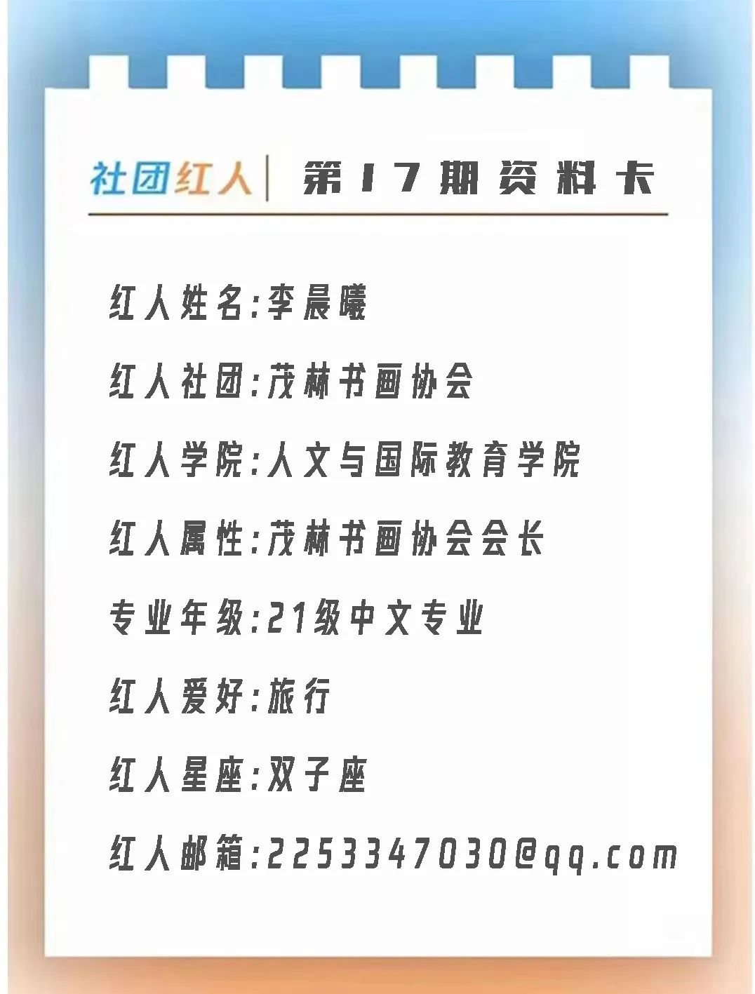 社团红人,又双叒叕来啦!这次是热爱书法的会长先来get本期的红人信息卡吧!▼