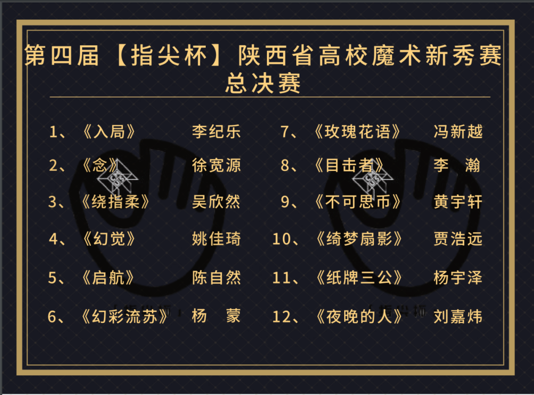 为紧密配合陕西省杂技艺术家协会年度工作安排,发挥新文艺组织人才培养的积极作用,增强社团交流,提高大学生魔术爱好者创意实践能力。由陕西省杂技艺术家协会、周化一魔术传承艺术委员会指导,陕西省高校魔术联盟、共青团西安培华学院委员会主办,西安培华学院学生会协办,西安培华学院魔术协会承办的第四届“指尖杯”陕西省高校魔术新秀赛总决赛,如约而至。