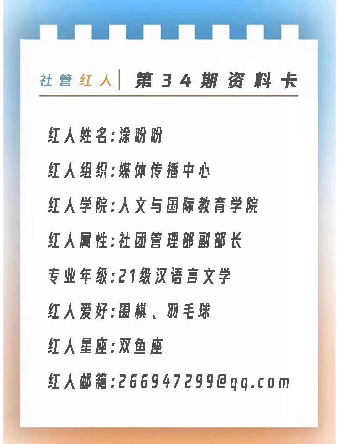 “糊涂”老师在生活中幽默风趣,在工作中则是社管大家庭中默默无闻却极其优秀的幕后工作者。培华社联这一年推文的结尾总会出现7个字——责任主编:涂盼盼。她总是用心制作每一篇推文,从标题的斟酌到内容的润色,再到排版的设计,每一个细节都经过她的反复推敲。每一篇推文都充满创意和美感,能够在第一时间吸引大家的目光。她的工作不仅仅是文字的组合,更是艺术的表达。虽然她的工作大多数时候都在幕后,但她的努力和付出却在每一篇推文中得到了最好的体现。她用实际行动诠释了“勤奋”、“用心”和“专业”的真正含义。正因为有她这样的优秀幕后工作者,我们的团队才能不断进步,才能为大家带来更好的内容和视觉享受。