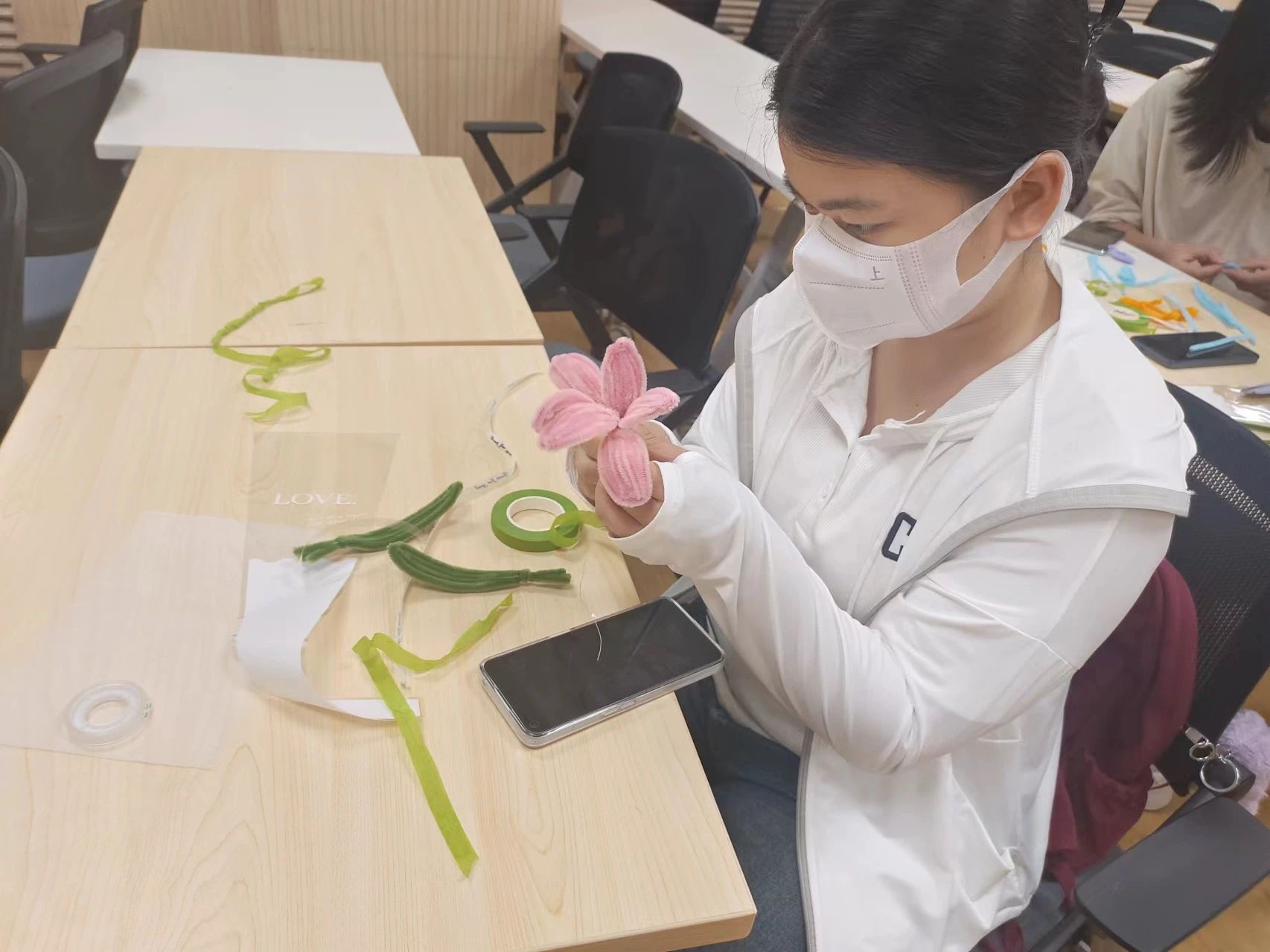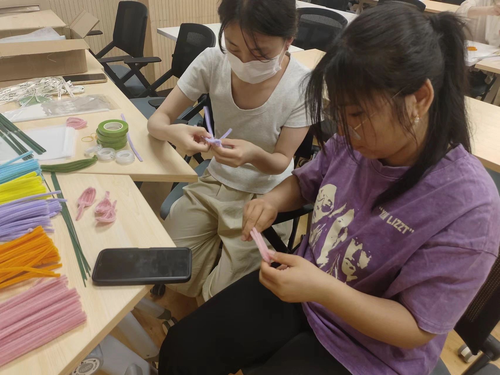 DIY活动正式开始后,大家根据教程进行尝试,与同伴相互分享自己的构思。将扭扭棒对折、弯曲,扭成一个个花瓣的形状,反复调整着花瓣的弧度与大小。饱含同学们心意的花朵雏形慢慢出现。