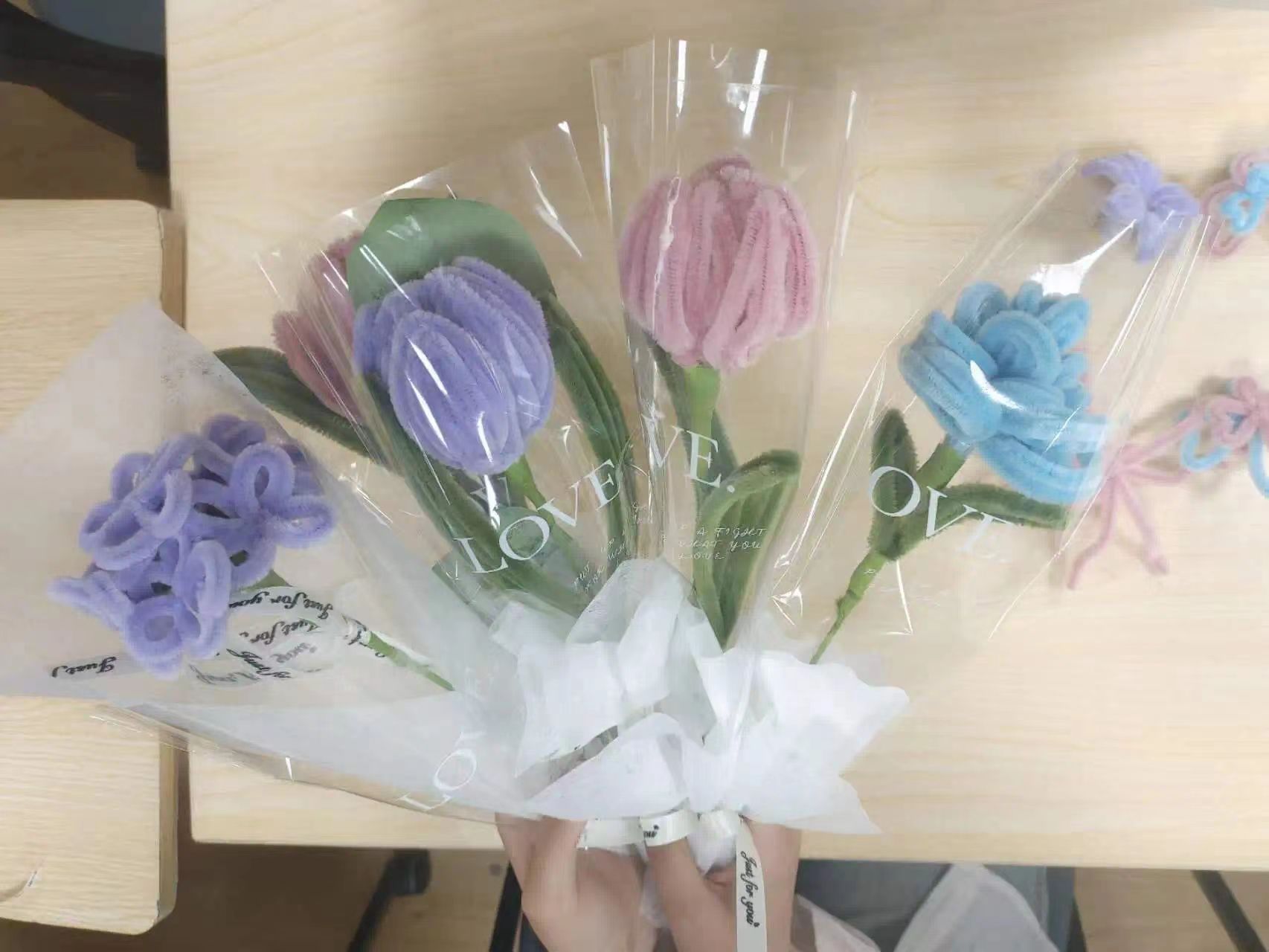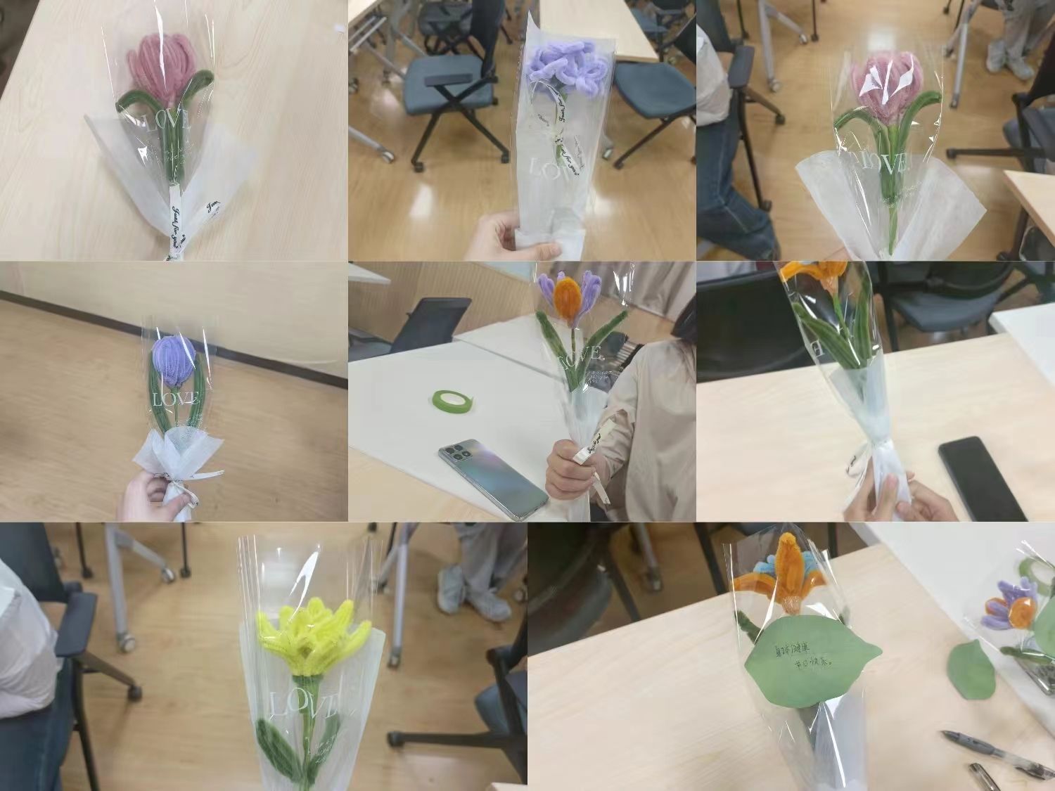 几束花完成后,领悟制作要领的大家便充分发挥创造力和想象力,扭出了各种风格的爱的产物。