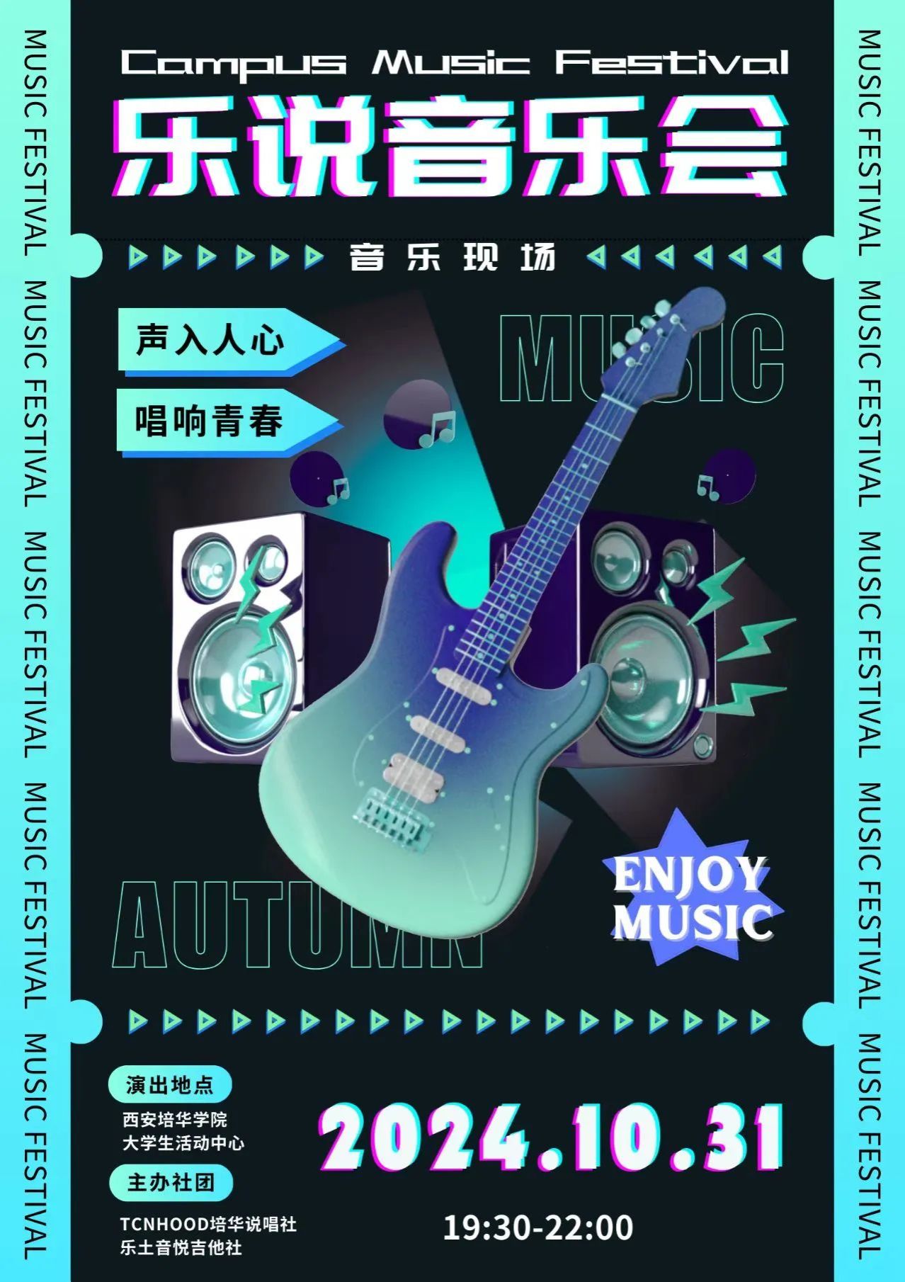 乐说音乐会,老时间 老地方,乐土音悦吉他社和TCNHOOD培华说唱社,让我们屏息以待,共同见证这场由两个社团共同演绎的梦幻之夜。他们将用他们的表演,告诉我们:无论是晨曦中的精灵,还是夜空中的星辰,都有着属于自己的光芒,都能在这个舞台上绽放出最耀眼的光彩!