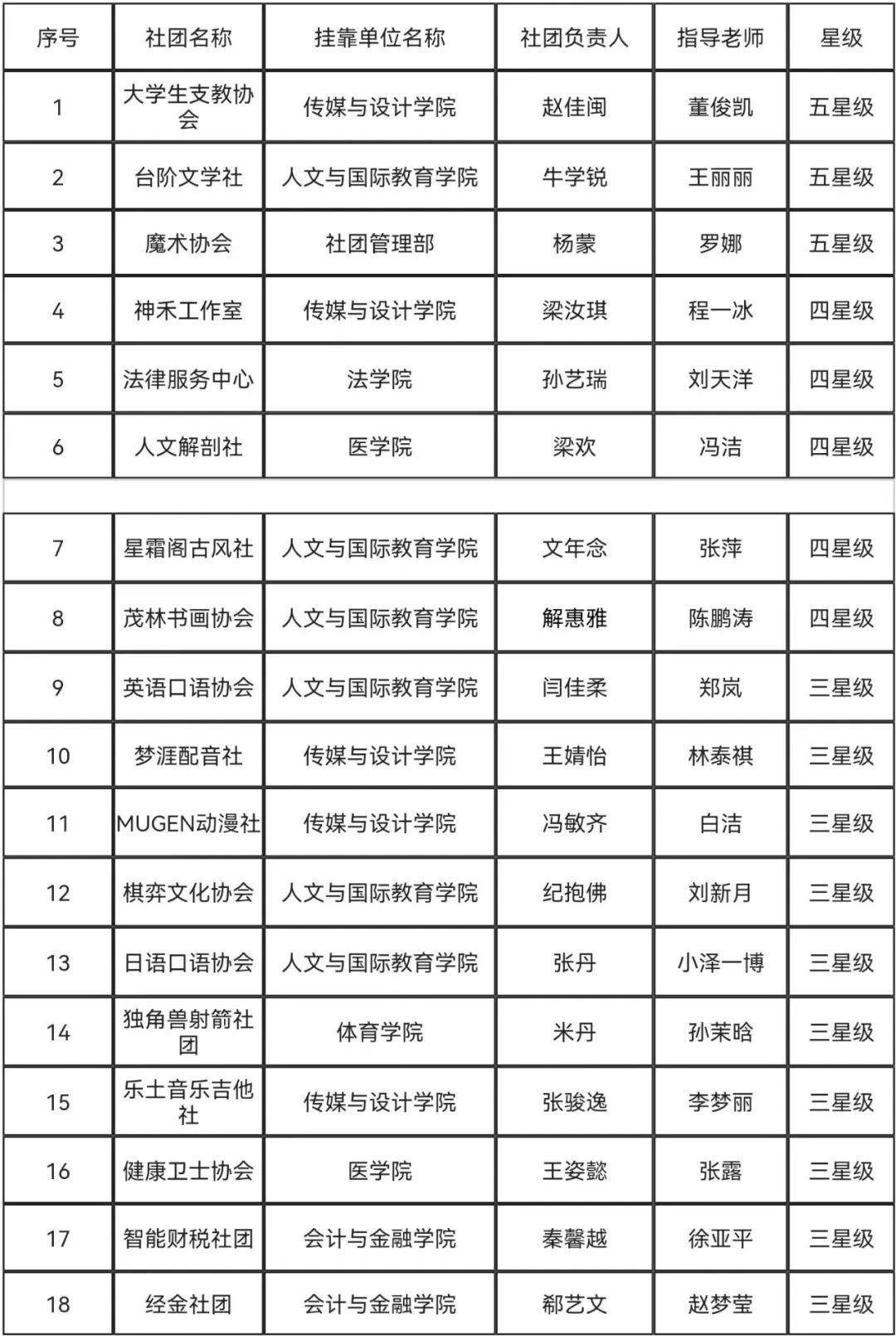 根据《西安培华学院2024年学生社团年度审核暨星级评定方案》,结合《西安培华学院学生社团管理办法(修订)》关于学生社团年审相关规定,校团委社团管理部全面负责组织开展学生社团年终审核工作。综合各学生社团年审材料、学生社团全年活动开展情况及日常管理情况从日常活动管理、新闻推送、组织建设及团支部成立、物资及区域化管理等多方面对目前在籍注册的90家学生社团进行考核评定,60 分以下(不含 60 分)为不合格,60—70 分(含 70 分)为合格,70—85(含 85 分)为良好,85 分以上为优秀。良好及以上学生社团参评星级社团。最终大学生支教协会等18家社团获评星级社团(包括五星级、四星级和三星级),台阶文学社等62家学生社团合格,耀阳跆拳道协会等10家学生社团未合格。现将2024年度学生社团年审结果以及星级评定结果具体情况公示如下: