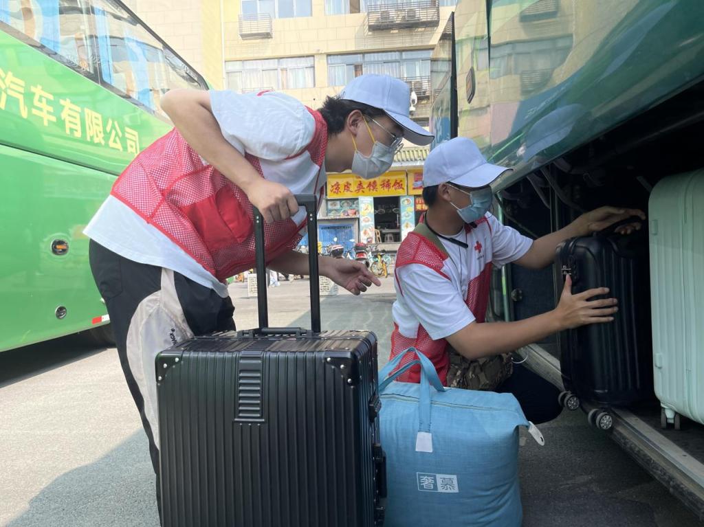 学校安排了便捷舒适的返校大巴,志愿者引导新生到达上车点,在完成扫描陕西一码通、测量体温、手部消杀的流程后,帮助新生将行李放入行李舱,确保他们全部安全上车之后,随车志愿者陪同新生一同抵校。
