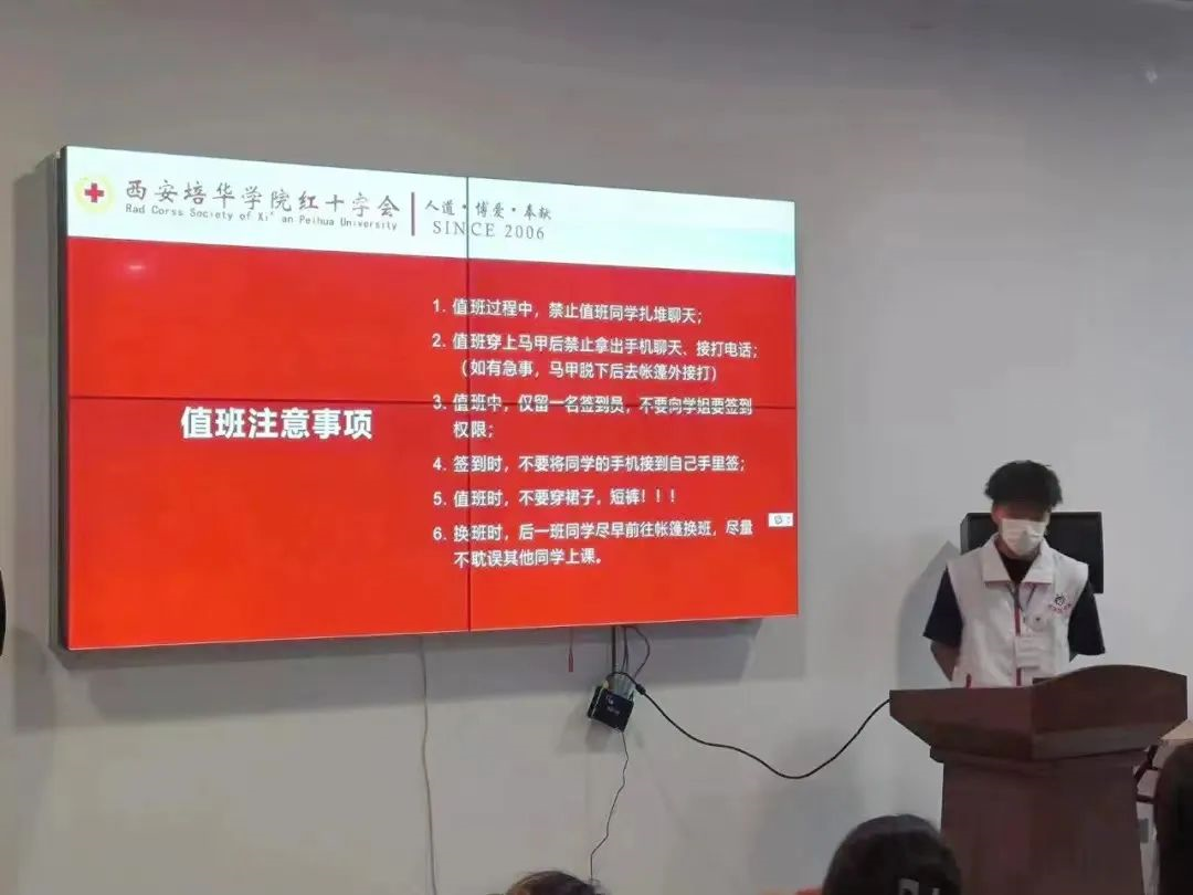 2022年5月25日下午七时,西安培华学院红十字会在恒友楼一楼北侧开放厅进行“生命传递,大爱永恒”活动前知识培训。由遗体与人体器官捐献志愿者服务队的陈佳伟向志愿者讲解了遗体与人体器官捐献的注意事项、基本条件、原则和流程,并强调了值班纪律,为活动的正式开始做足准备。