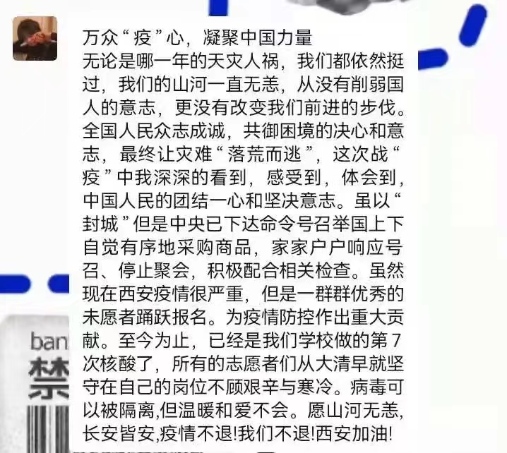 让我们一起共渡难关,一起迎接2022年美好的春天!青年一代,加油!长安,加油!中国,加油!