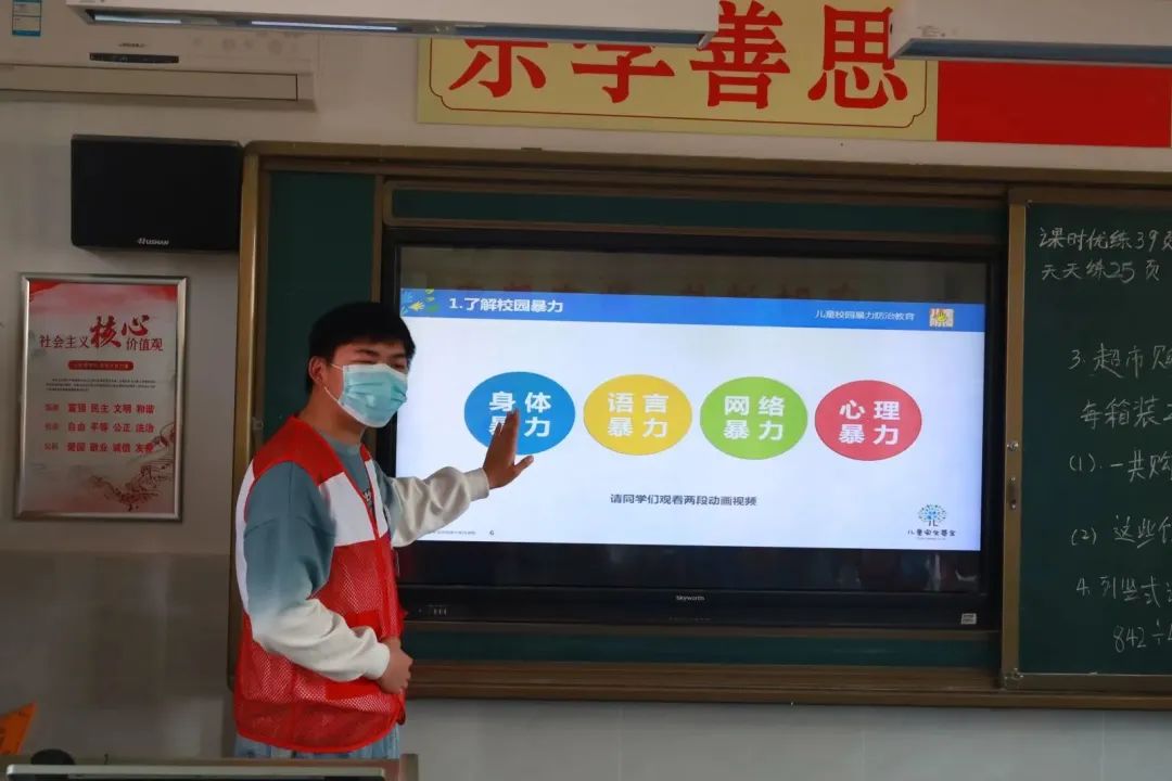 第一堂--防校园暴力志愿者们走进课堂,进行儿童五防中防校园暴力和防意外的宣讲,教会同学们认识校园暴力,了解校园暴力的危害以及解决措施。志愿者们也在认真倾听着同学们所分享的故事,了解他们对校园暴力的看法。