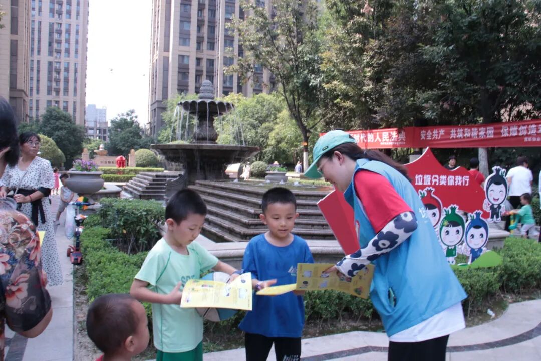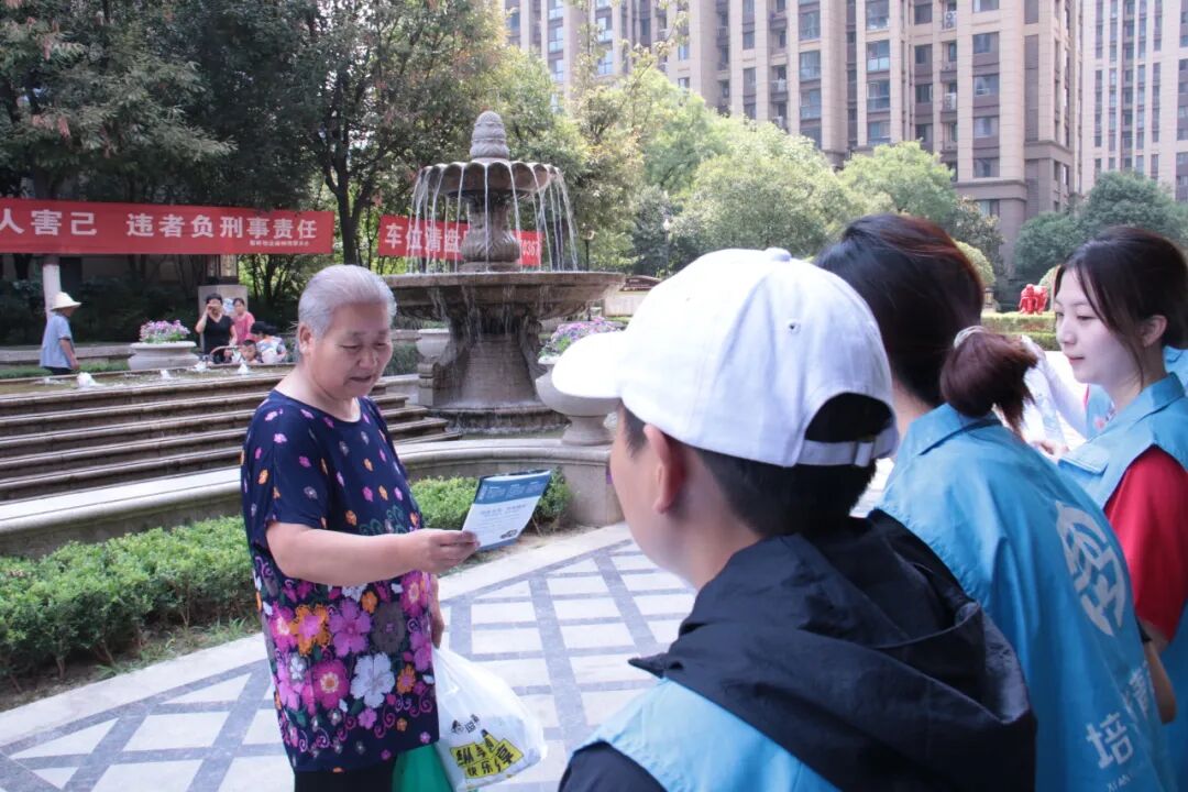 在社区工作人员的指导下,队员们在社区内,向广大居民分发禁毒知识手册并向他们讲解禁毒相关知识。