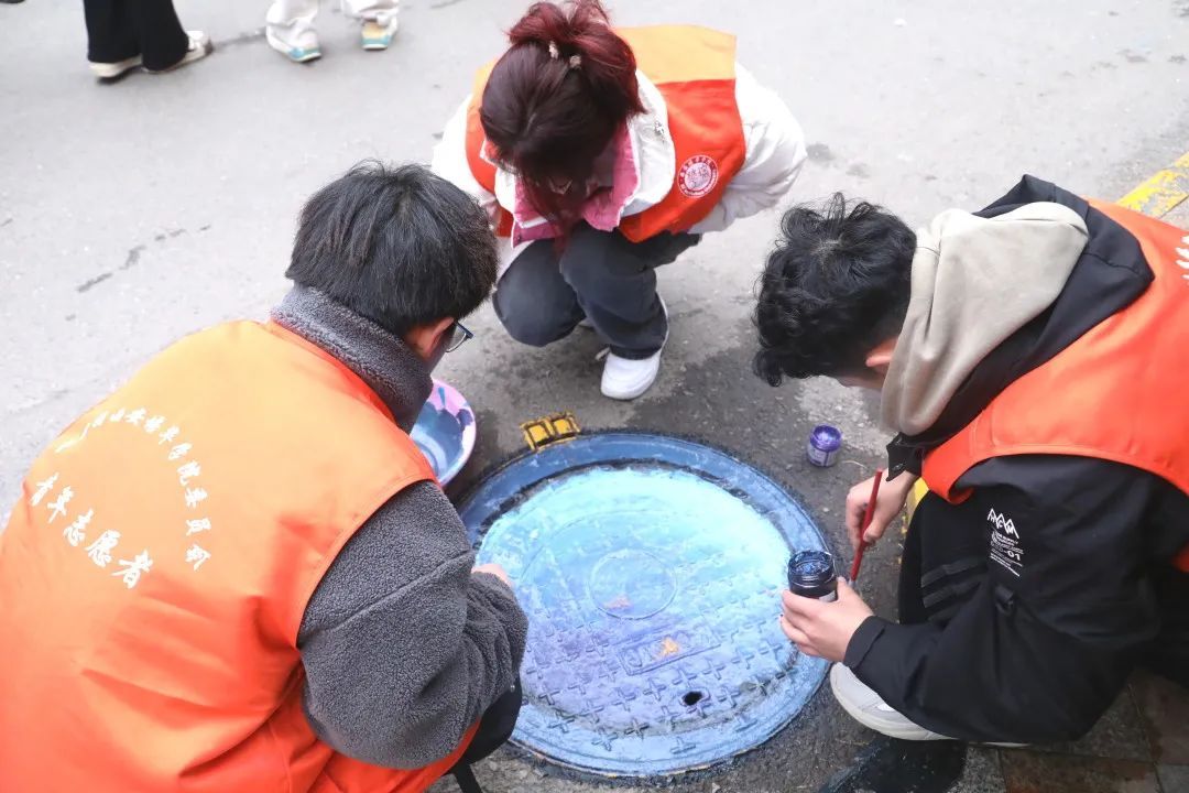 传媒与设计学院的志愿者们提前准备好了绘井盖所需的颜料、画笔等工具,精心挑选了色彩明丽、充满童趣的卡通形象作为样板。创作过程中他们相互协作、相互学习。