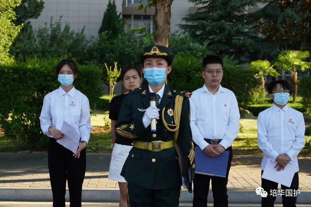 迎着清晨的第一缕阳光,东方出现了瑰丽的朝霞,不远处的树枝沐浴着阳光,那抹轻柔的光投向了树叶,在碧蓝的天空下折射出了清亮的绿光,树叶的微微抖动让阳光在地面上有了婆娑的光影,国旗护卫队队员早早来到南门,静候第十六周升旗仪式的开始。