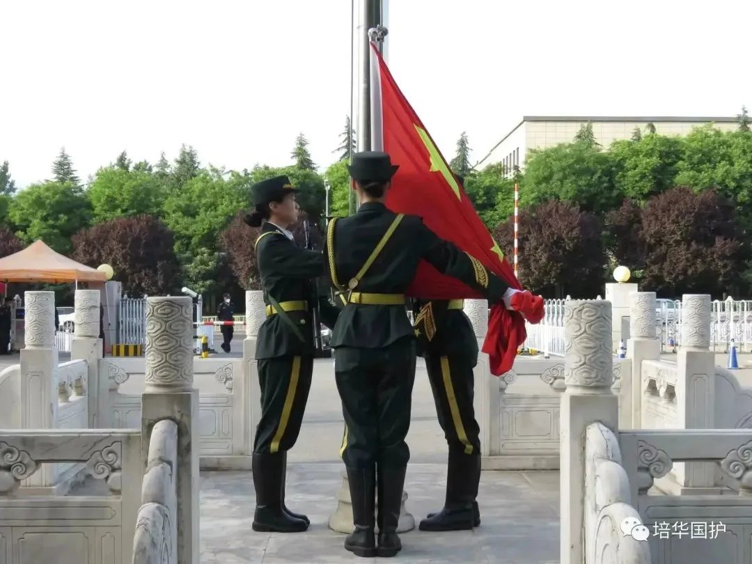 护旗手手持九五,礼服上洒满阳光,将麦穗照的闪闪发亮。所有人昂首阔步,精神饱满的走到各自位置。旗台上,《义勇军进行曲》响起,旗手振臂奋力一甩,五星红旗迎风招展。随着音乐的结束,护旗手将五星红旗准时的送上了南门上空。