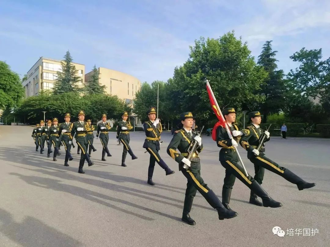 随着主持人话音的落下,伴着《中国人民解放军进行曲》,升旗仪式正式开始。刀手的口令雄厚嘹亮,回荡在南门的每一个角落。队列步伐铿锵,力争步幅分毫不差。