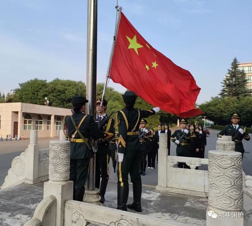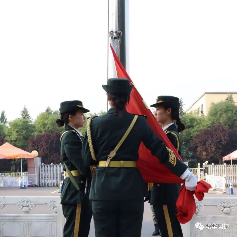 伴随着激昂的国歌,队员们护着五星红旗,迈着铿锵有力的步伐,走向升旗台。旗组配合默契,动作整齐划一,在第一缕晨光的见证下,五星红旗冉冉升起。