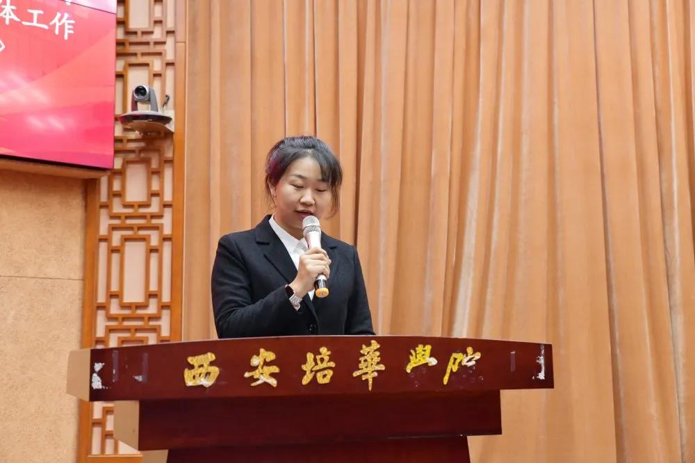 ▲团委工作部部长董莹老师宣读《共青团西安培华学院委员会关于选聘2020-2021学年校团委培小青新媒体工作室负责人、干事的聘任通知》