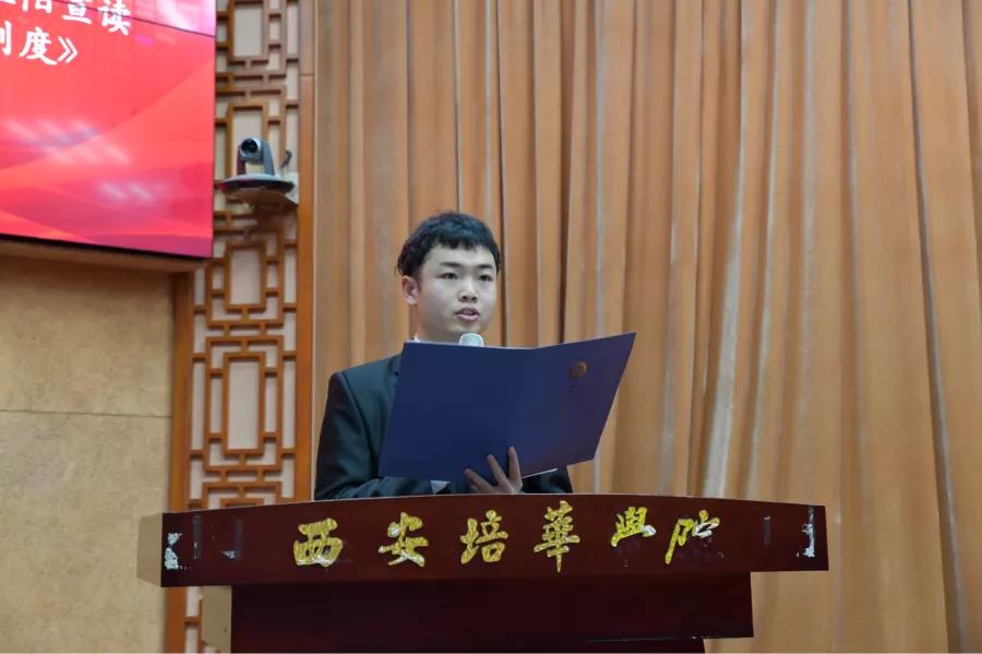 ▲培小青新媒体工作室副主任许正阳同学宣读《培小青新媒体工作室管理制度》
