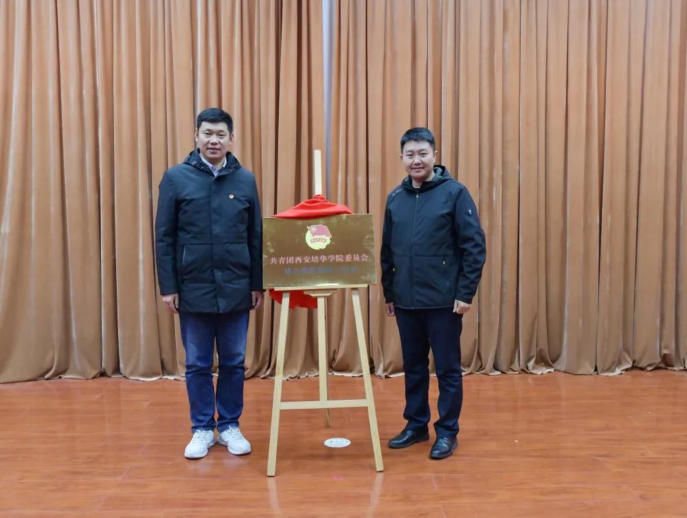 ▲党委宣传部部长、新闻中心主任柳雨老师,党委学工部部长、校团委书记蔡亮老师为培小青新媒体工作室揭牌