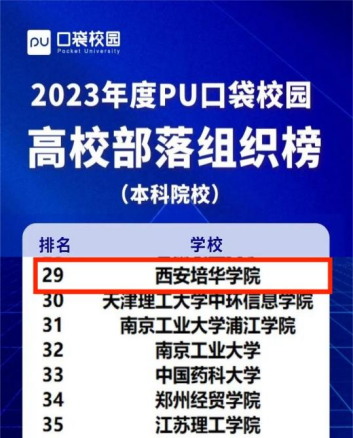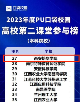近日,由PU口袋校园产品运营中心发布的第二课堂年度榜单(本科院校前50名榜单)中,西安培华学院入围第二课堂参与榜、第二课堂部落组织榜,分别位列第27名和第29名,这是我校持续推动第二课堂成绩单工作高质量发展取得的良好成绩。