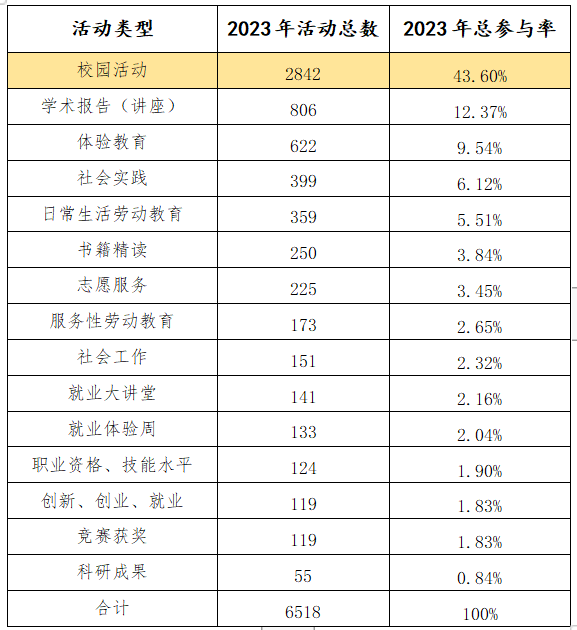 2023年的活动包含种类较多,其中校园活动类开展活动数量最多,参与率最高,其他项目活动数量相比上年均呈现正增长。