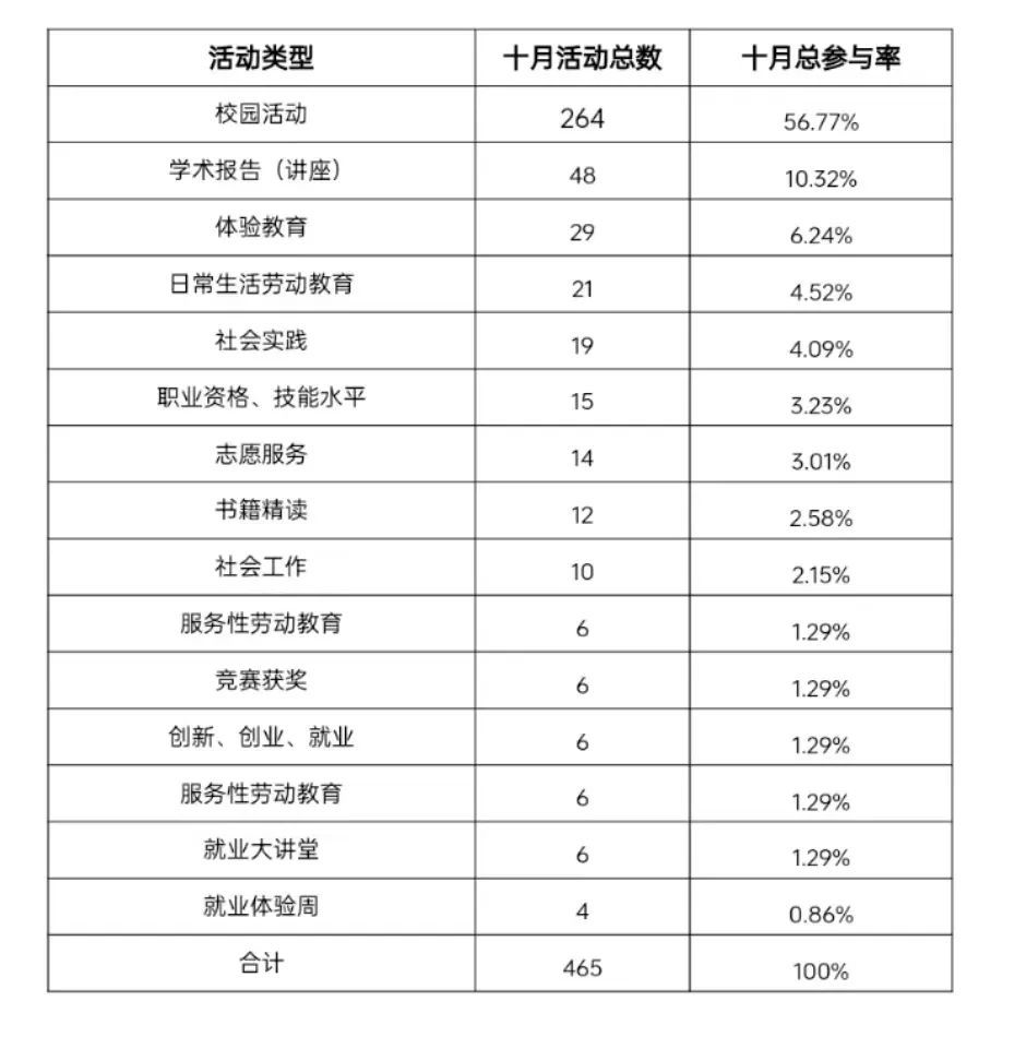 如下表所示,十月份活动参与情况中,2020级、2021级和2022级学生参与活动总人数占比99.99%,2020级学生参与总人数占比不足4%。