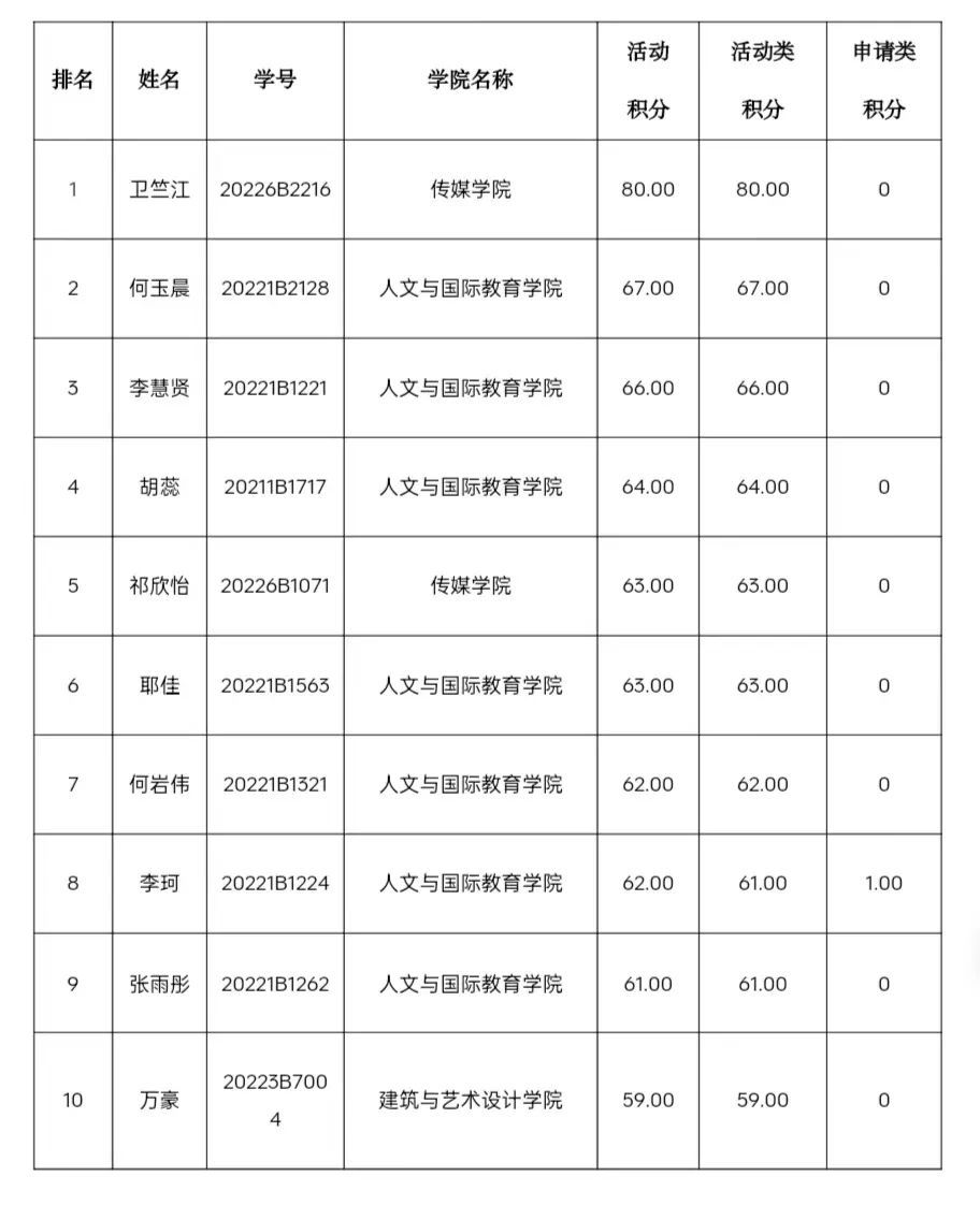 十月份个人积分增长分数最高的同学依次为卫竺江、何玉晨、李慧贤、胡蕊、祁欣怡、耶佳、何岩伟、李珂、张雨彤、万豪。
