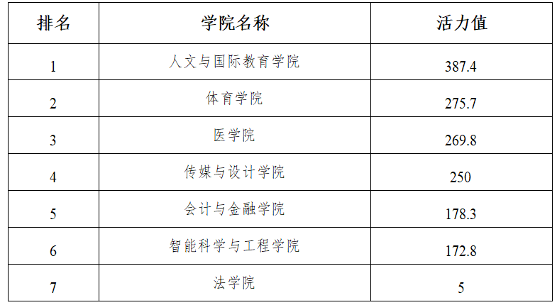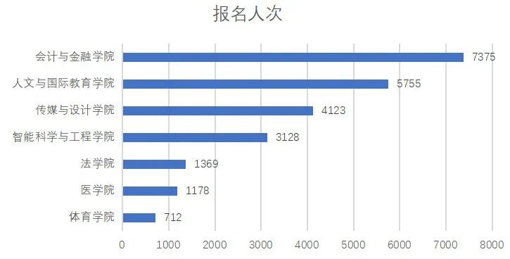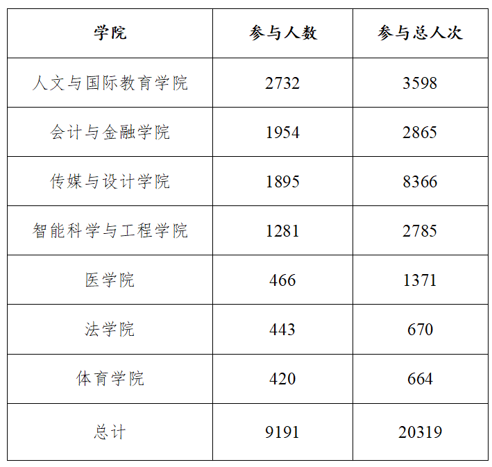 “五育并举”社会实践活动,参与总人数达到9191人,共计20319人次,其中人文与国际教育学院参与人数2732 人;会计与金融学院参与人数1954人;传媒与设计学院参与人数1895人;智能科学与工程学院参与人数1281人;医学院参与人数466人;法学院参与人数443人;体育学院参与人数420人。