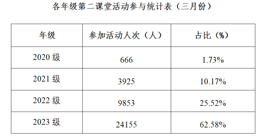 如下表所示,三月份活动参与情况中,2020级、2021级、2022级和2023级学生参与活动总人数占比分别为1.73%、10.17%、25.52%和62.58%。