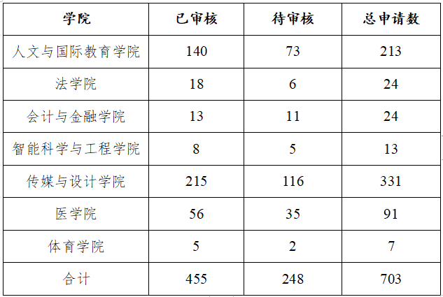 三月份“学雷锋”志愿服务活动三月份申请数总计703次,其中已审核455次,待审核248次;传媒与设计学院总申请数最高为331次,体育学院最少为7次。
