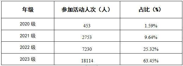 如下表所示,四月份活动参与情况中,2020级、2021级、2022级和2023级学生参与活动总人数占比分别为1.59%、9.64%、25.32%和63.45%。